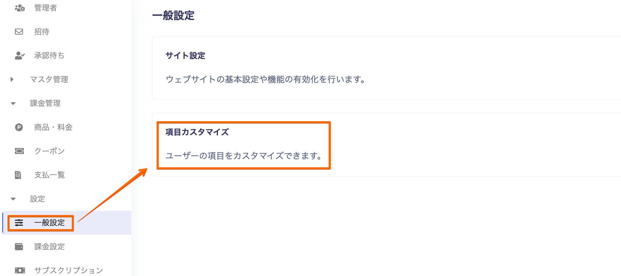 OneStream管理画面にログインし、メニューより「設定」→「一般設定」→「項目カスタマイズ」を選択します。
