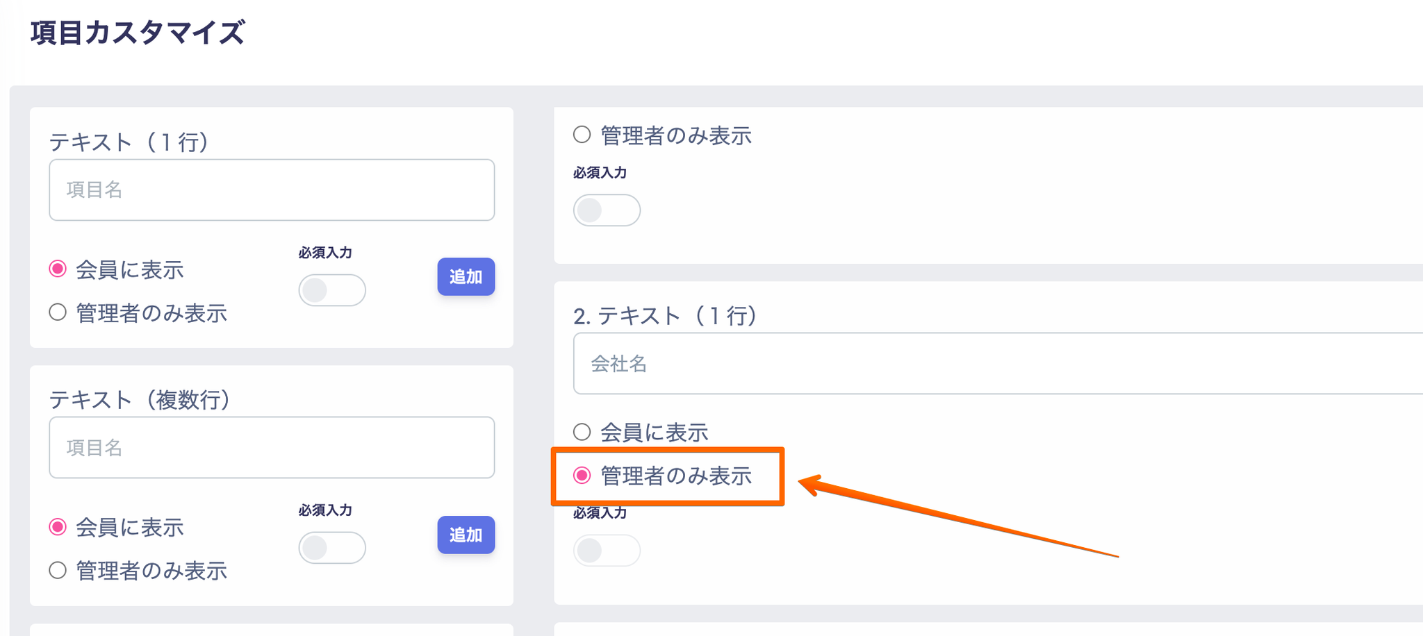 既に登録しているユーザーの回答を消したくない場合は、「管理者のみ表示」に変更し新しい項目を追加してください