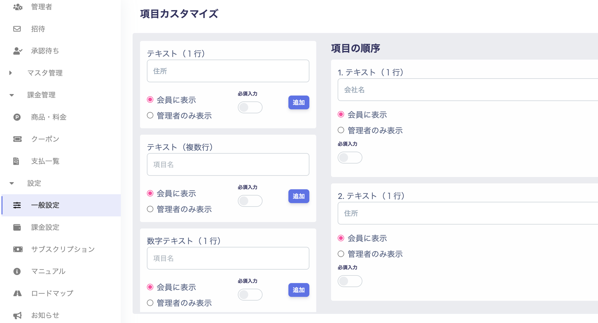 「必須入力」にチェックを入れると、会員の新規登録時に該当項目の入力が必須となります。