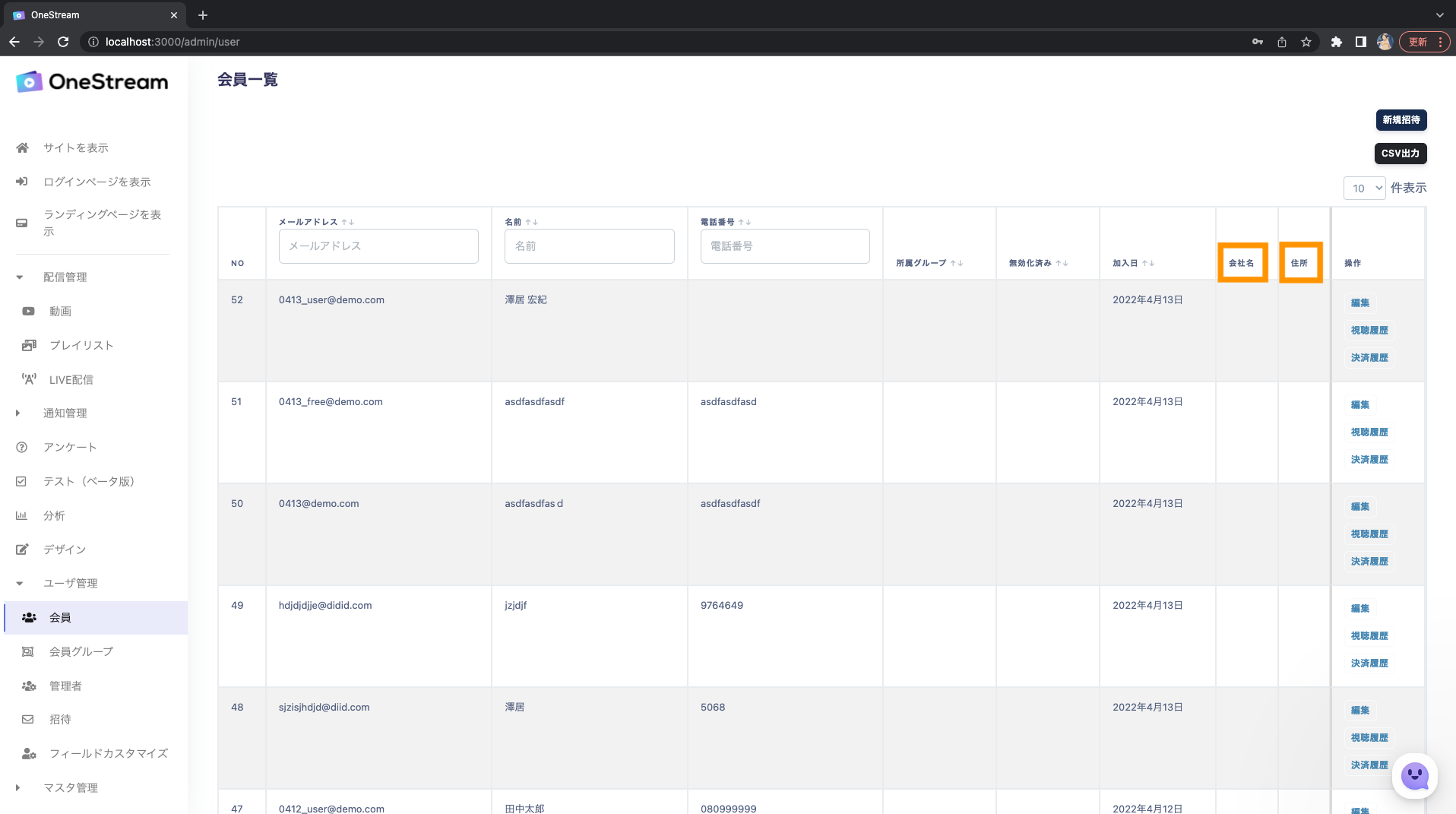 •会員一覧画面に「会社名」と「住所」の項目が追加されていることが確認できます