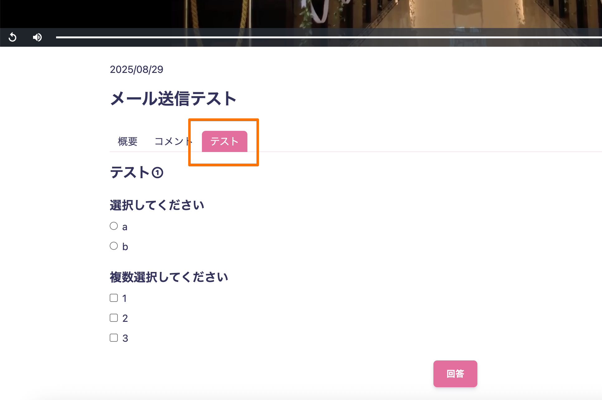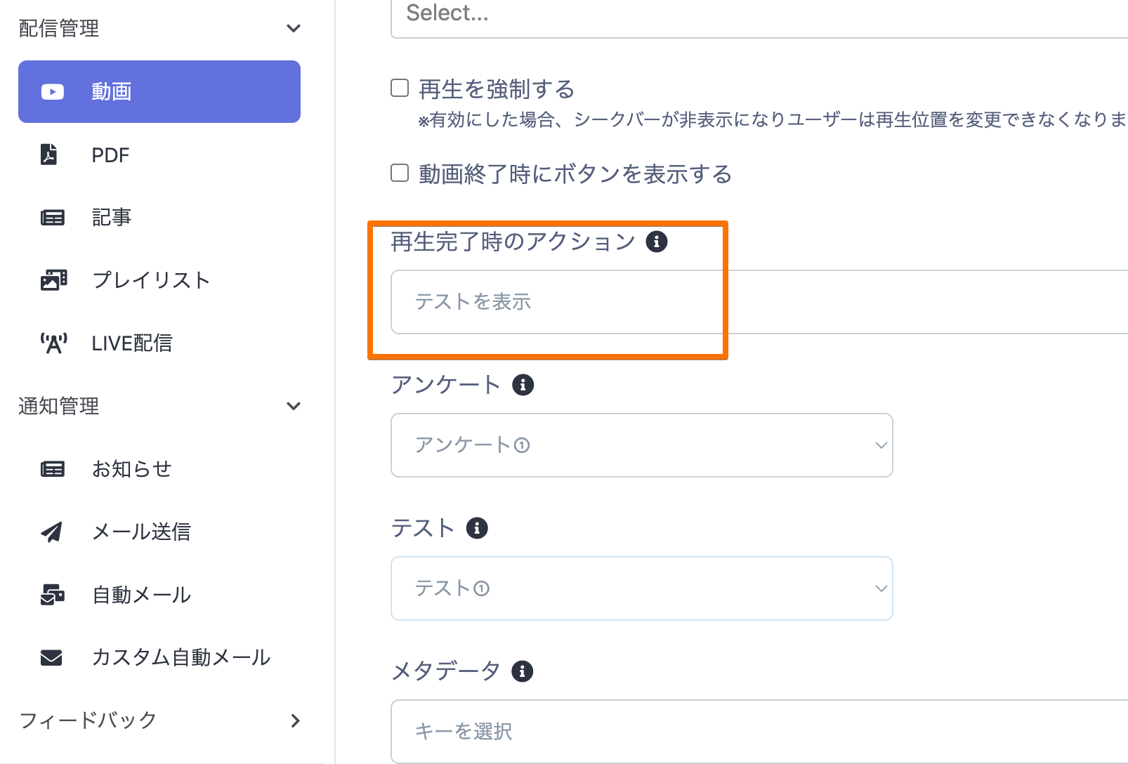 1つの動画に アンケート と テスト の両方を設定することが可能です。これにより、動画視聴後に理解度チェックと意見収集を同時に行うことができます。設定方法管理画面で配信管理 → 対象の動画 → 再生完了時のアクション を設定します例:「再生完了時のアクション」にテストを設定した場合→ 動画再生後に「テスト」がポップアップとして表示 されます。アンケートは概要の下部に表示されます