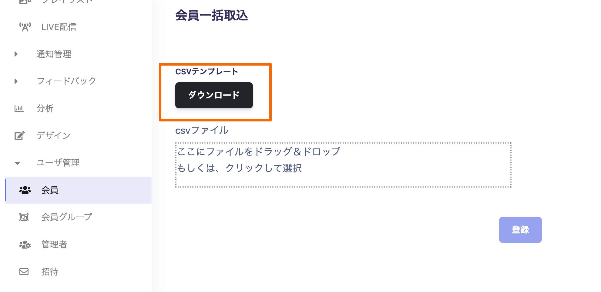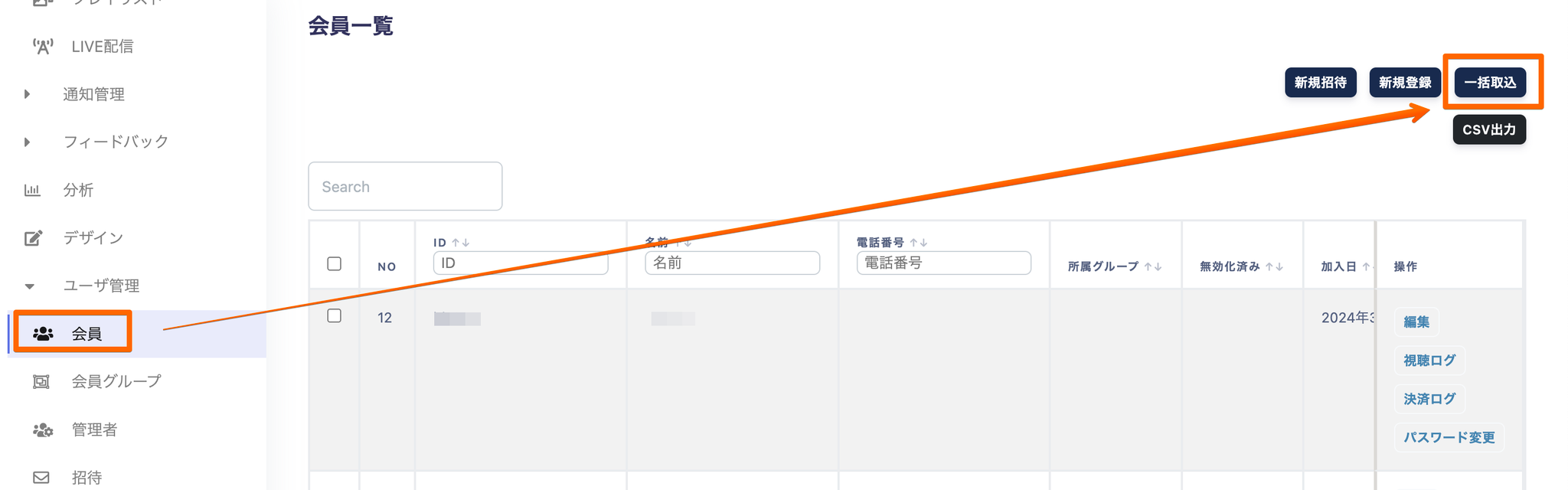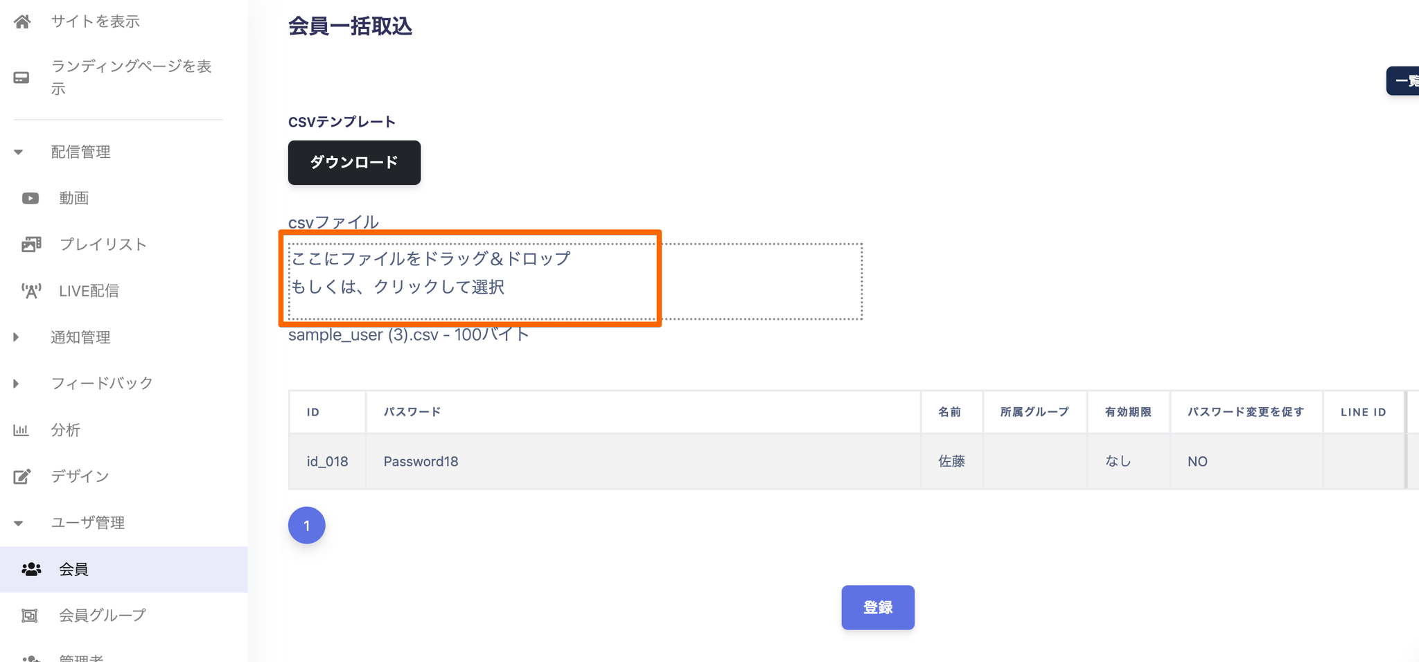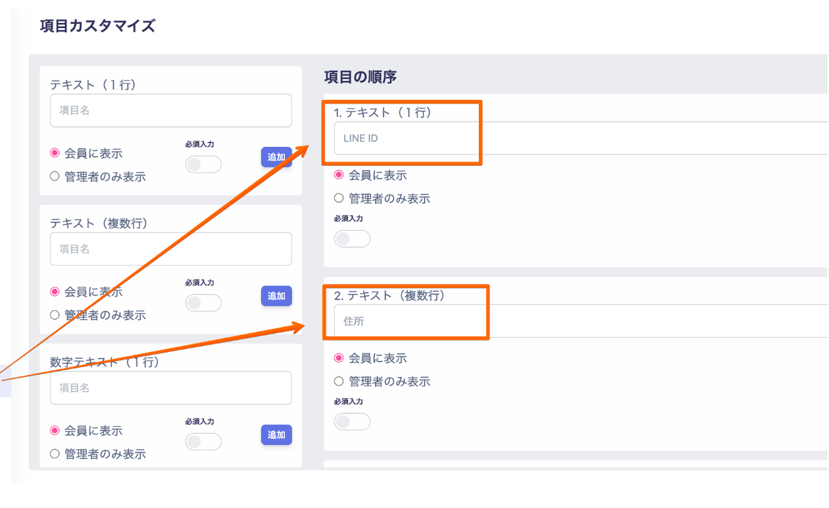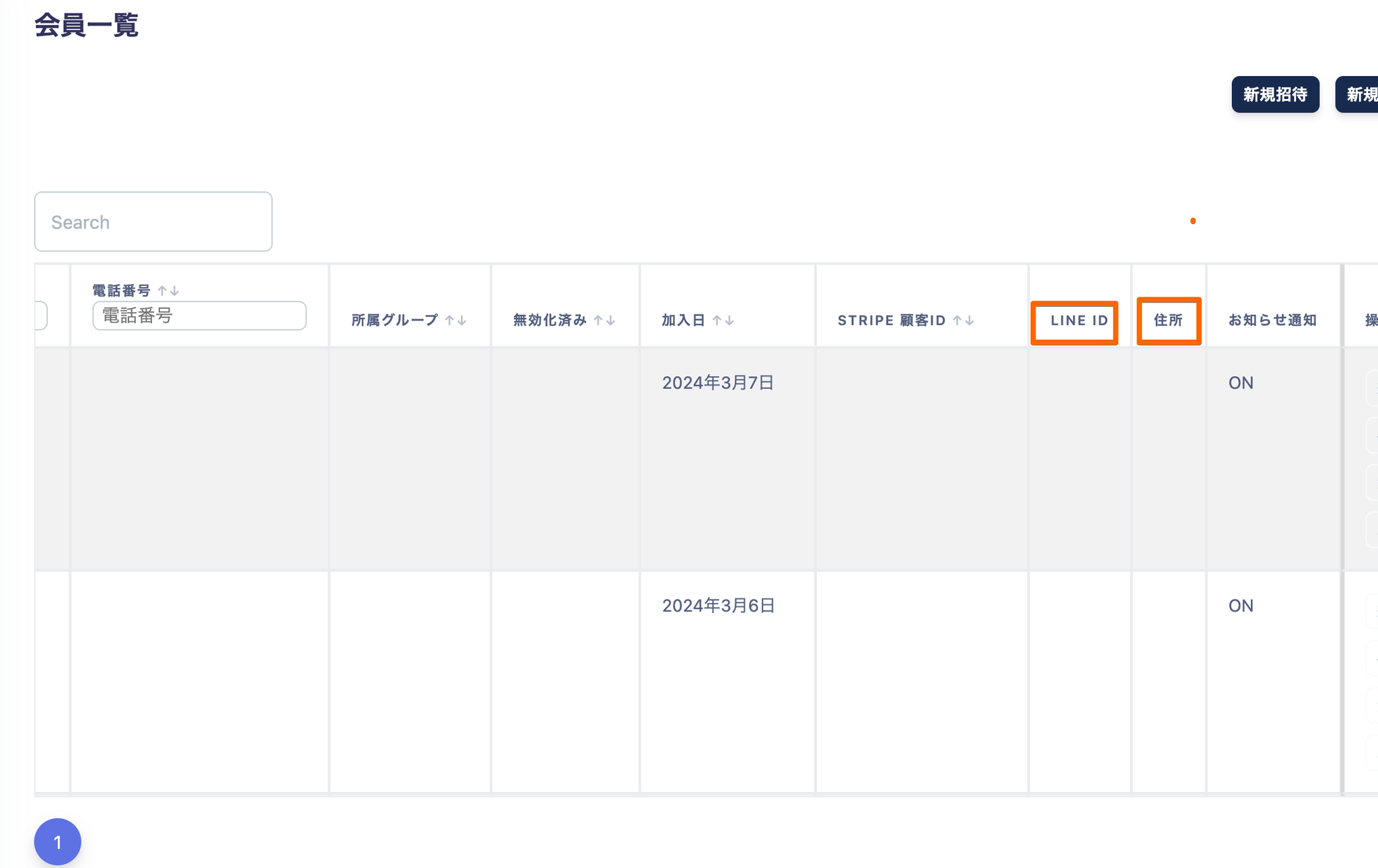 CSV取り込み時にカスタム項目を追加する方法①項目カスタマイズより追加したい項目を作成今回は「LINE ID」「住所」を追加します②ユーザー管理→会員→一括取り込み③CSVテンプレートダウンロード④ダウンロードしたCSVの項目に①で作成した項目を追加項目は作成頂いたそのままをコピしてください⑤CSVファイルをドラック&ドロップもしくはクリックして選択し取り込む追加した項目が取り込まれました