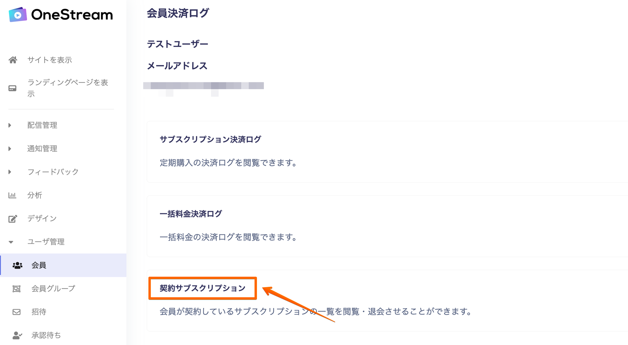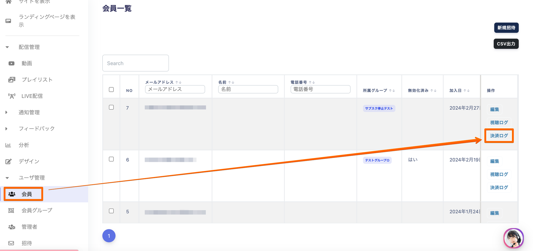 •ユーザー管理→会員→対象の会員の決済ログを押下
