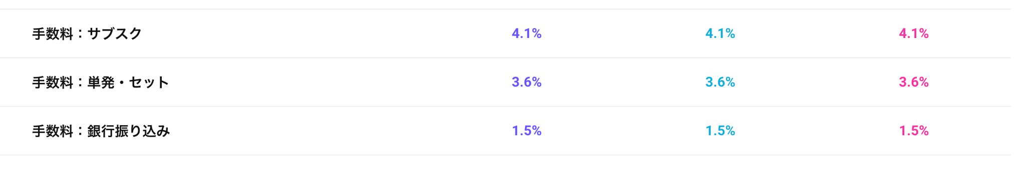 OneStreamの決済手数料は、決済手段や、商品種類によって異なります。