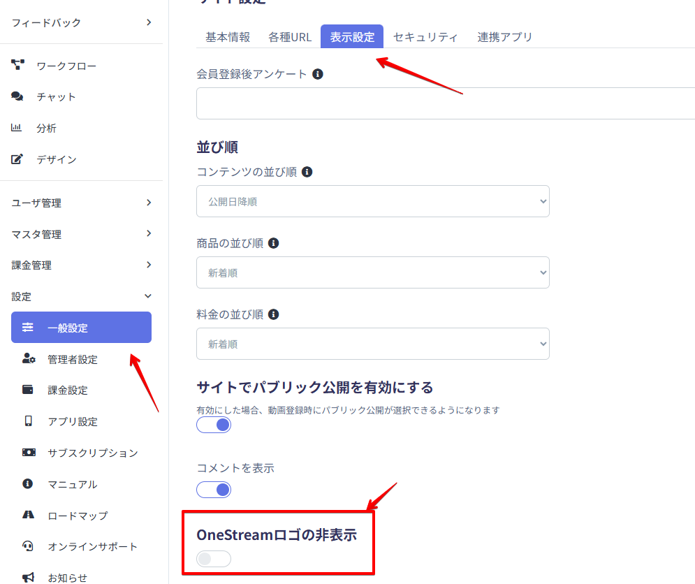 「一般設定」→「表示設定」タブにある「OneStreamロゴの非表示」にチェックを入れてください。