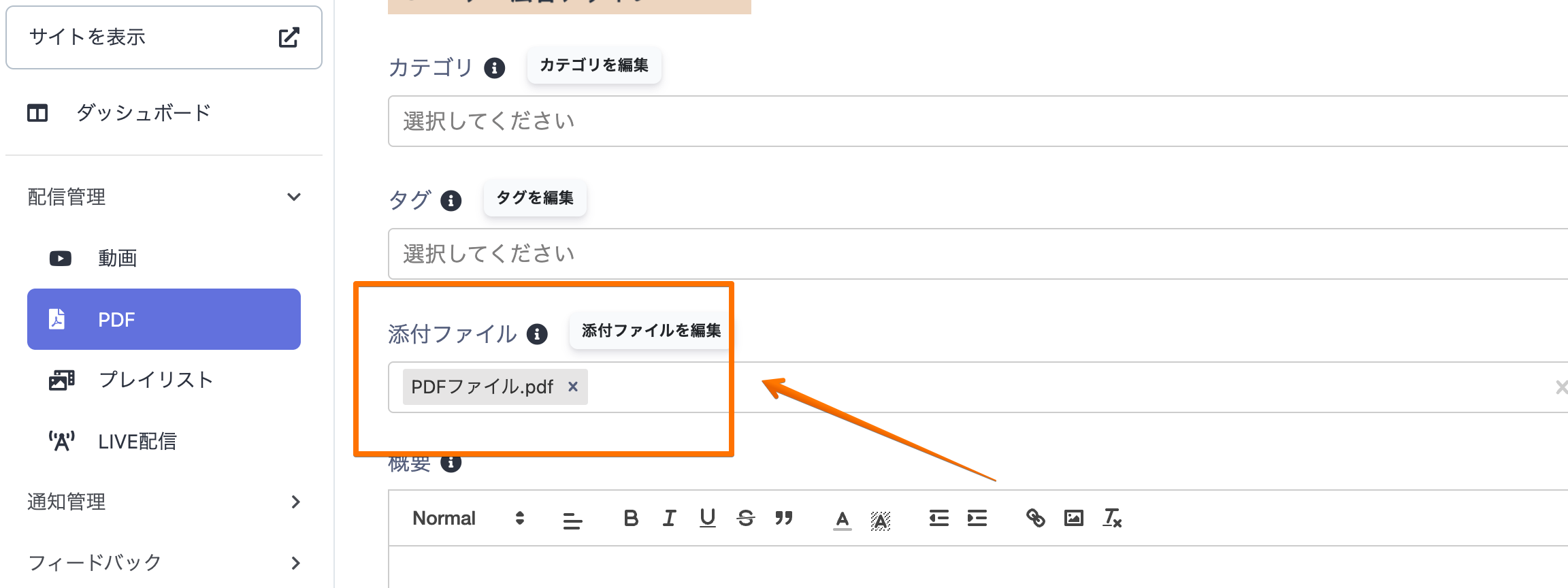 ・添付ファイル:添付ファイル一覧から、配信対象のPDFファイルを選択してください