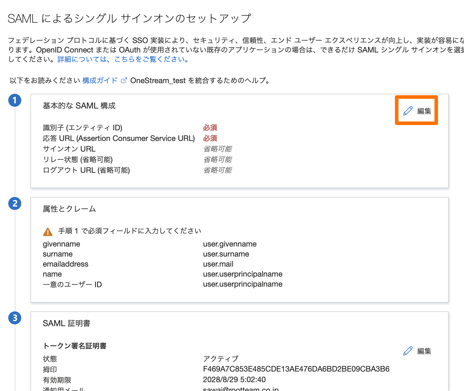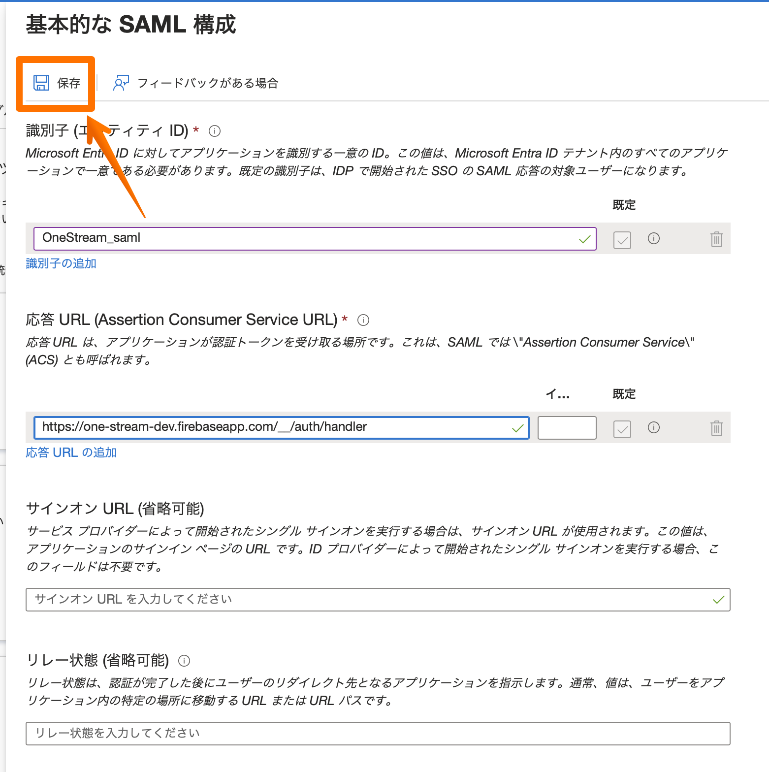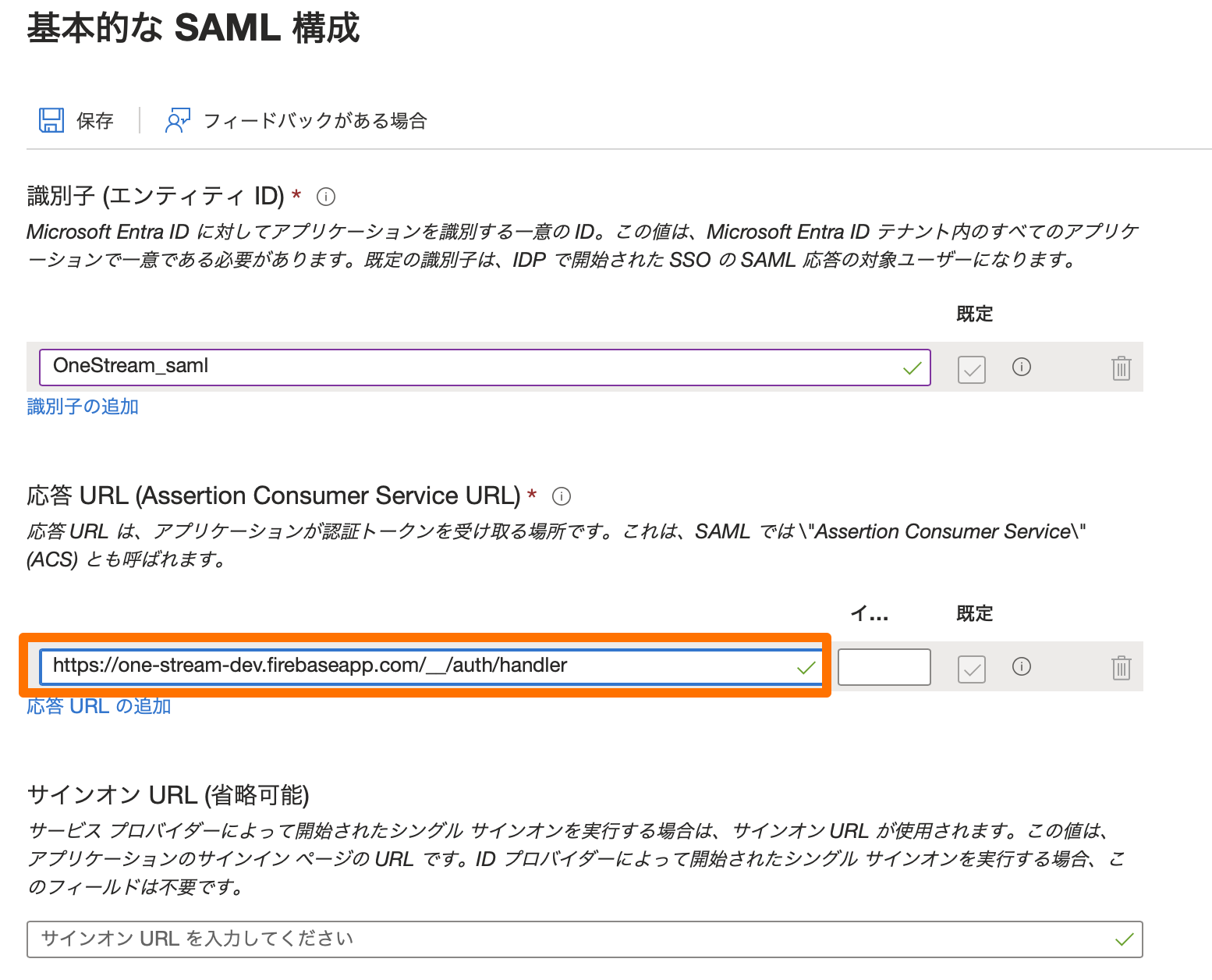 ・「応答 URL (Assertion Consumer Service URL)」に「https://one-stream-dev.firebaseapp.com/__/auth/handler」を入力(左記の値は開発環境専用)
