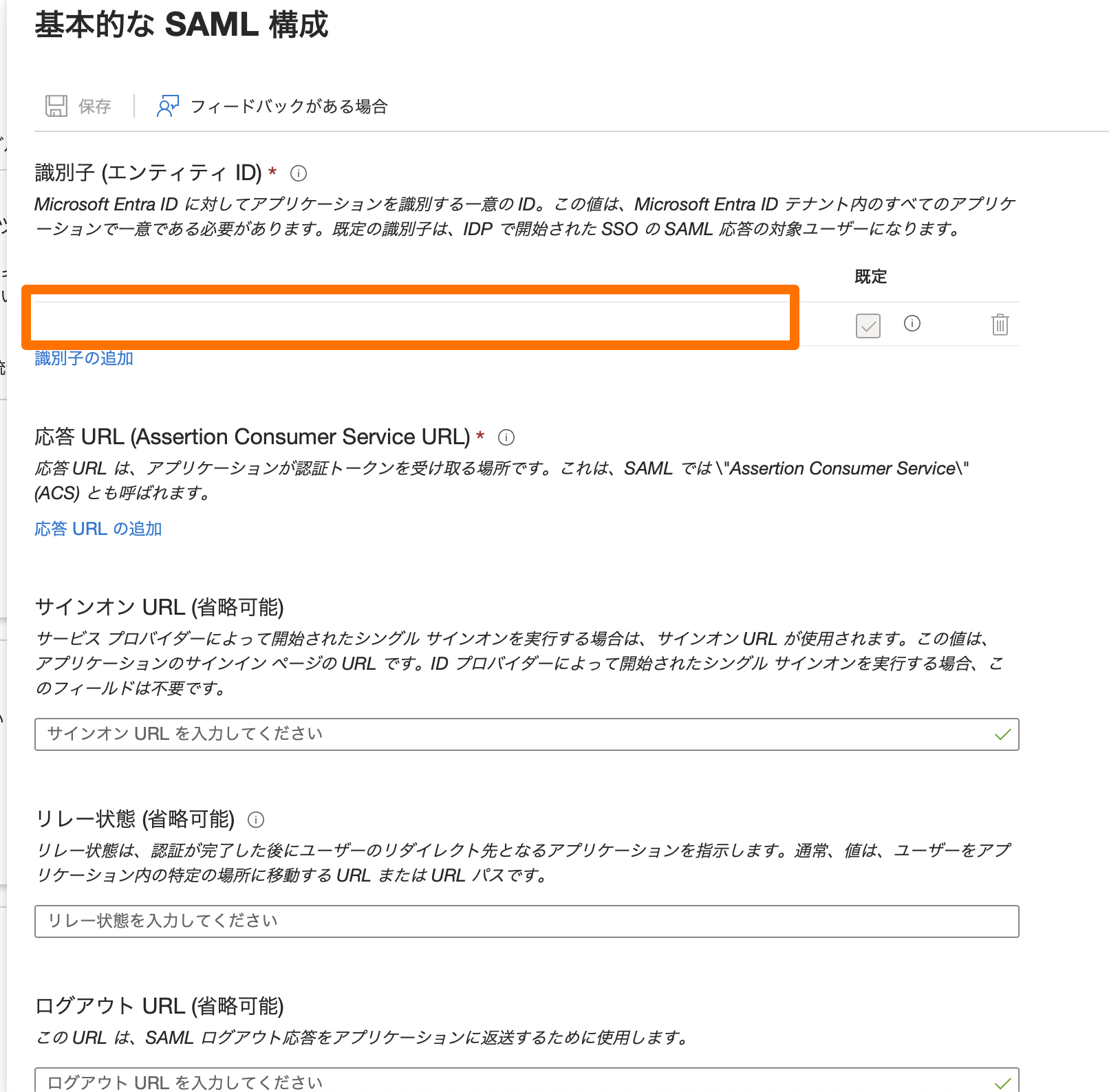 「識別子 (エンティティ ID)」に「https://one-stream.io」or 「https://one-stream-dev.io」(独自ドメインの場合は独自ドメインの値)を入力
