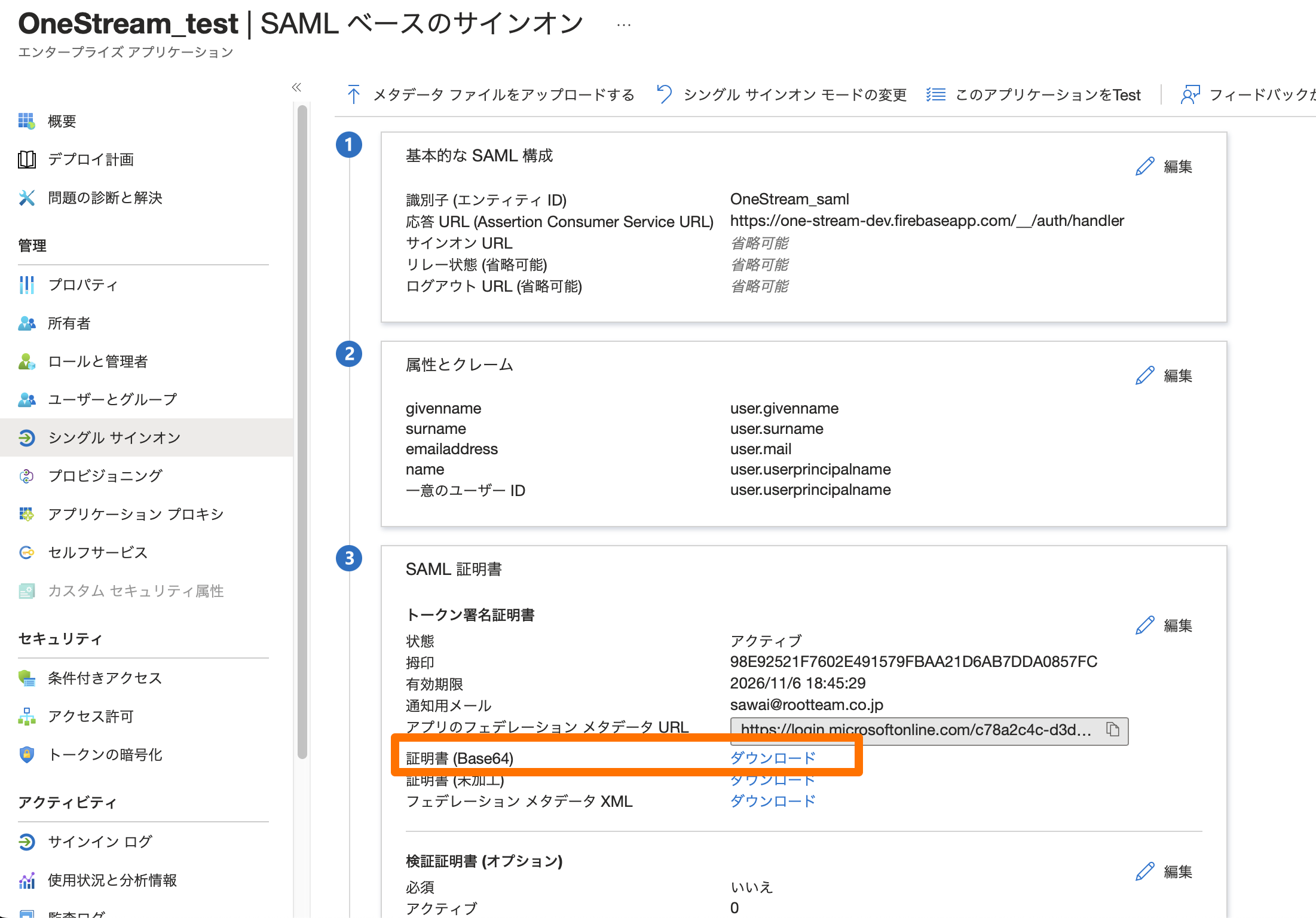 3.「SAML 証明書」の「証明書 (Base64)」をダウンロードして、送付をお願いします