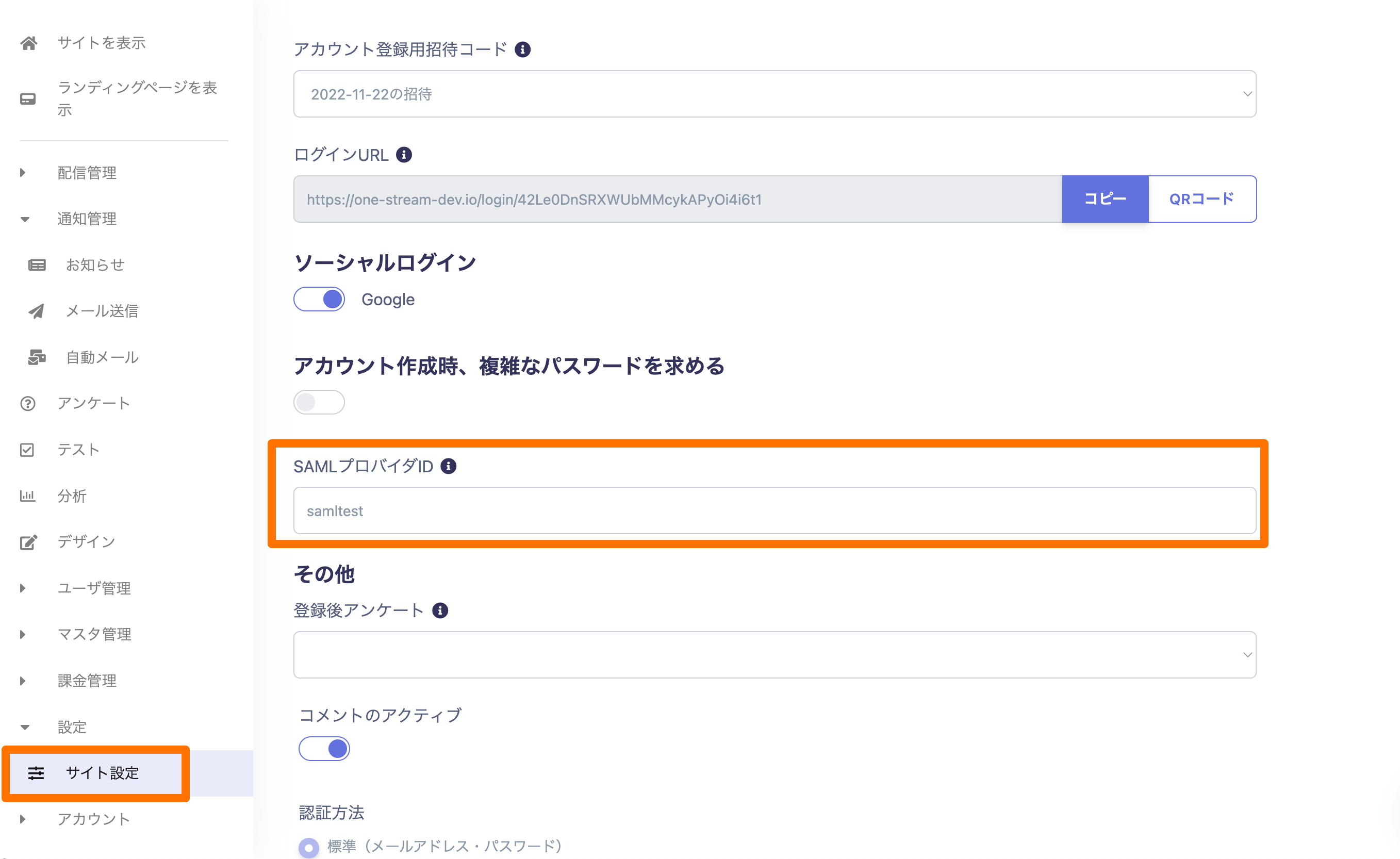 ・OneStreamにログインし、サイト設定画面のセキュリティタブで「SAMLプロバイダID」を入力し、保存してください