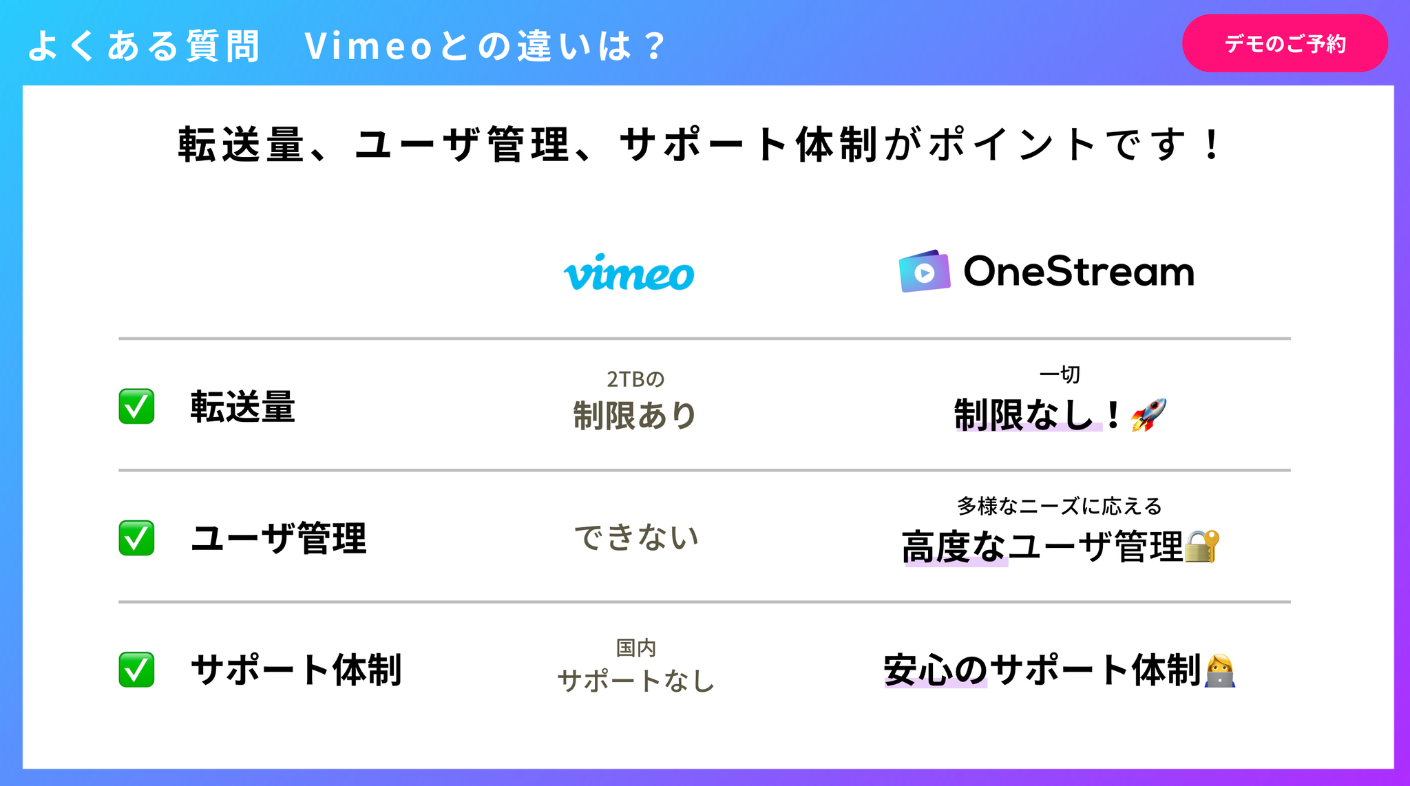 Vimeoとの違いはなんですか?Vimeoはクリエイティブなコンテンツ制作者向けのプラットフォームですが、OneStreamは企業の利用に特化しており、企業のニーズに合わせたカスタマイズや統合が可能です。