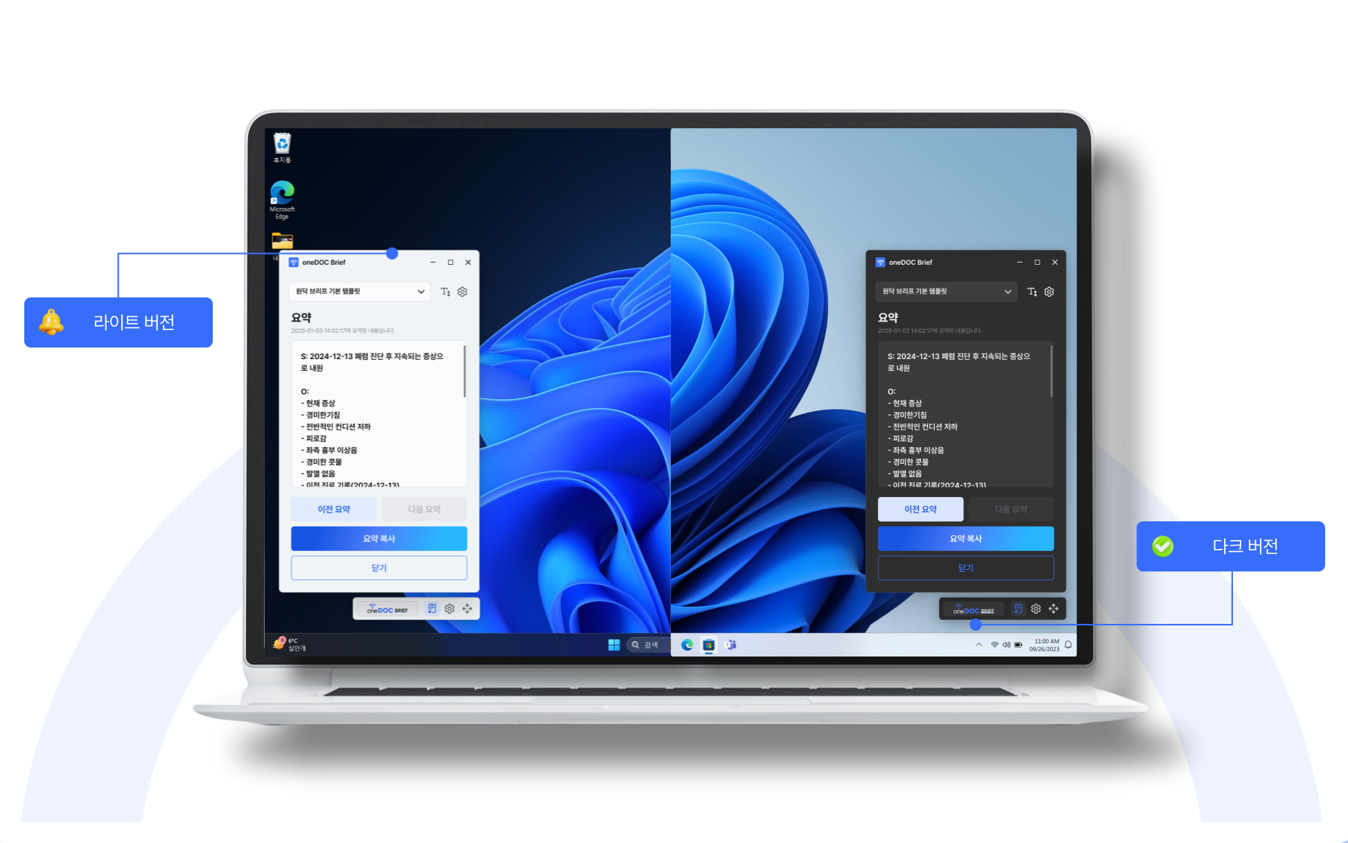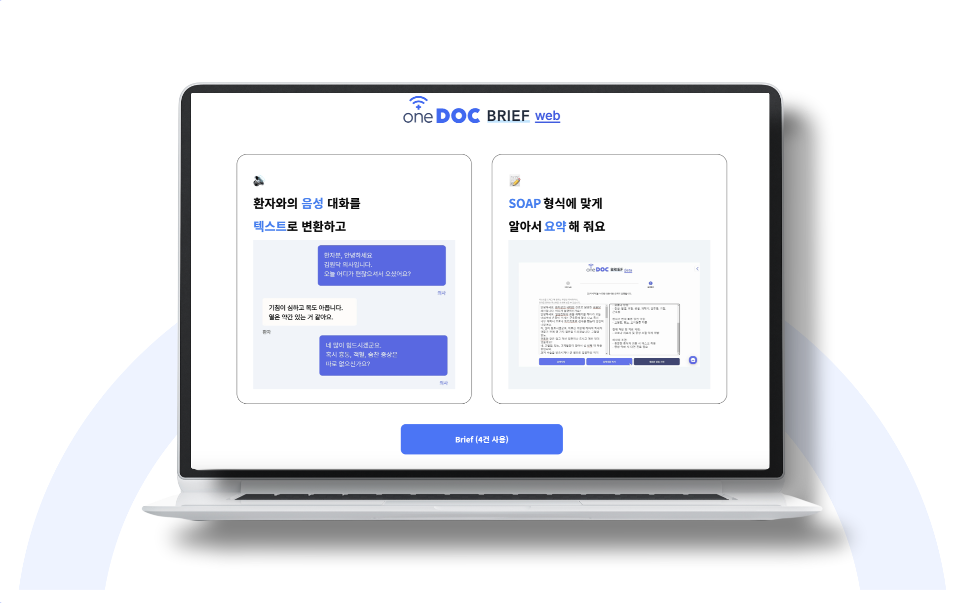 [oneDOC Brief] 버튼 클릭(음성 인식 및 Brief AI 기능 시작) > 다시 한번 클릭(진료종료) > 요약내용이 자동으로 클립보드에 복사 > 사용중인 차트에 붙여넣기!