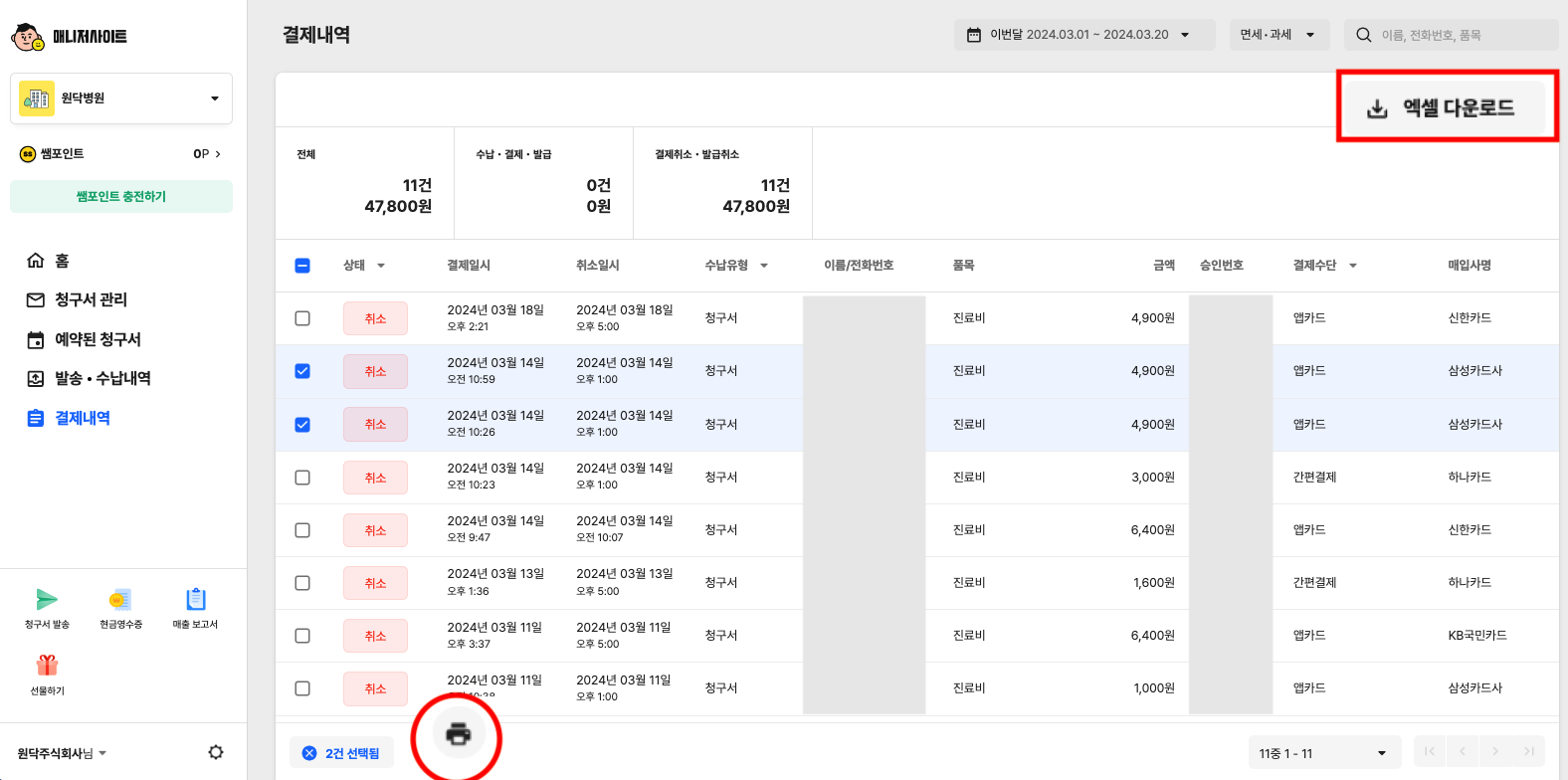 환자 선택 > [인쇄 아이콘] 또는 [엑셀 다운로드] 후 출력