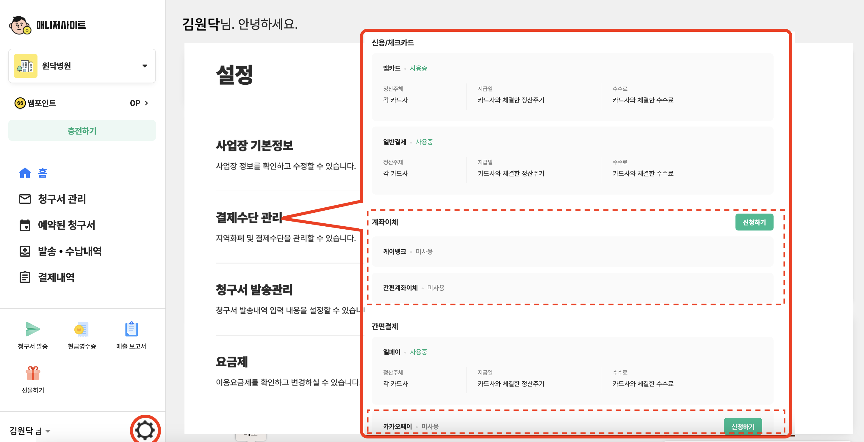 좌측 하단 [설정] > [결제 수단 관리]