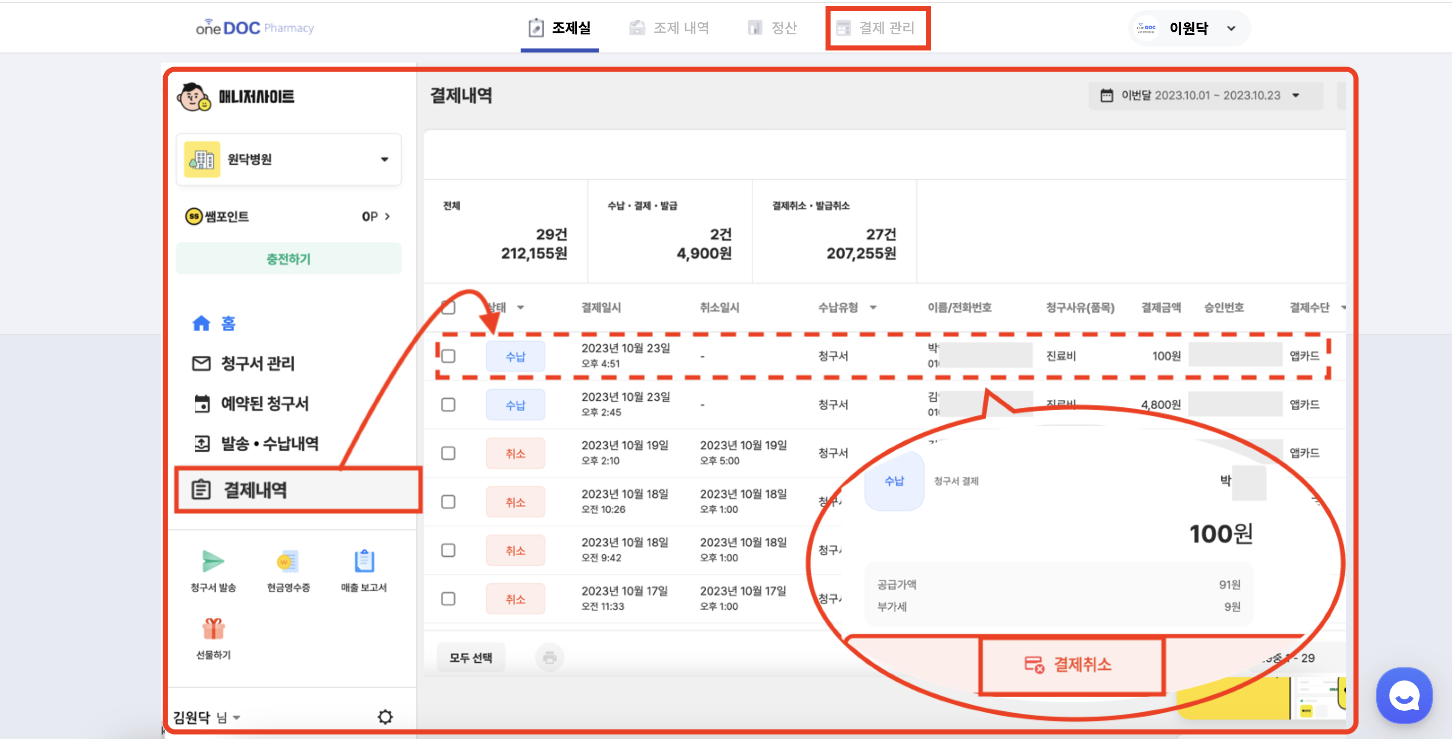 좌측 메뉴 > [결제 관리]