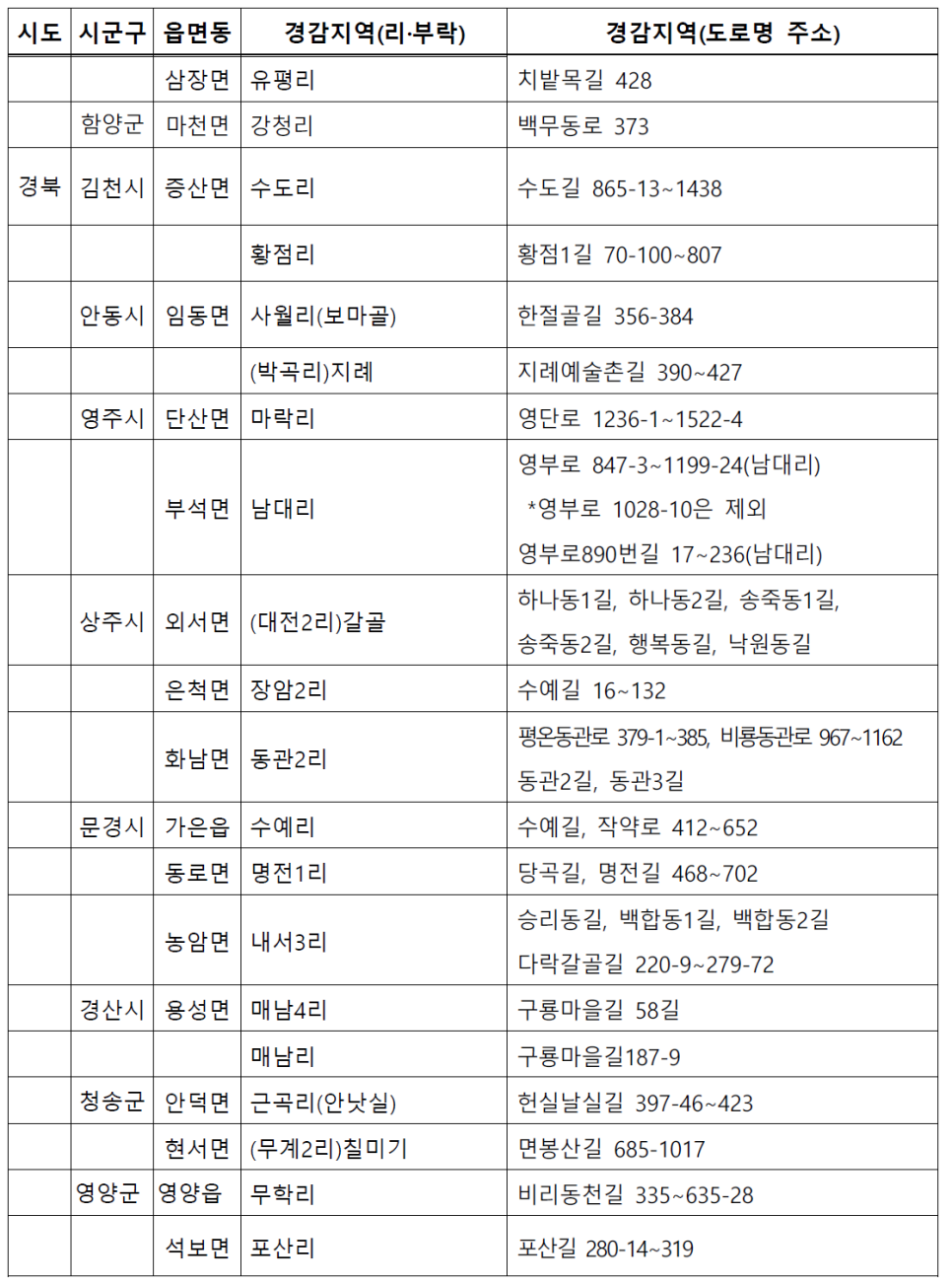 9. 경북 | 15 | 고령군, 문경시, 봉화군, 상주시, 성주군, 영덕군, 영주시, 영양군, 영천시, 예천군, 울릉군, 울진군, 의성군, 청도군, 청송군 |