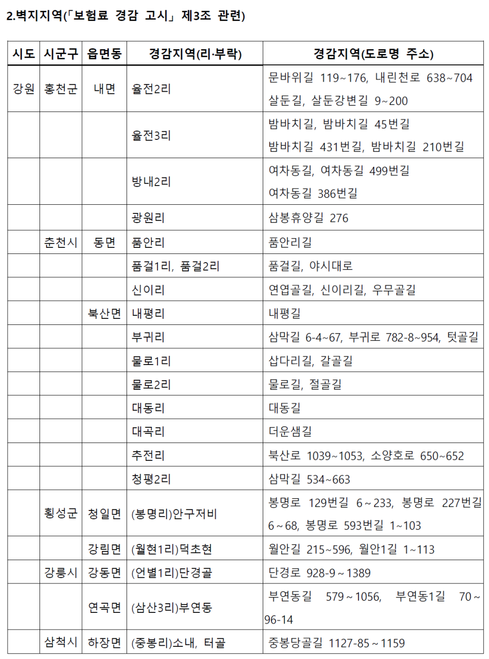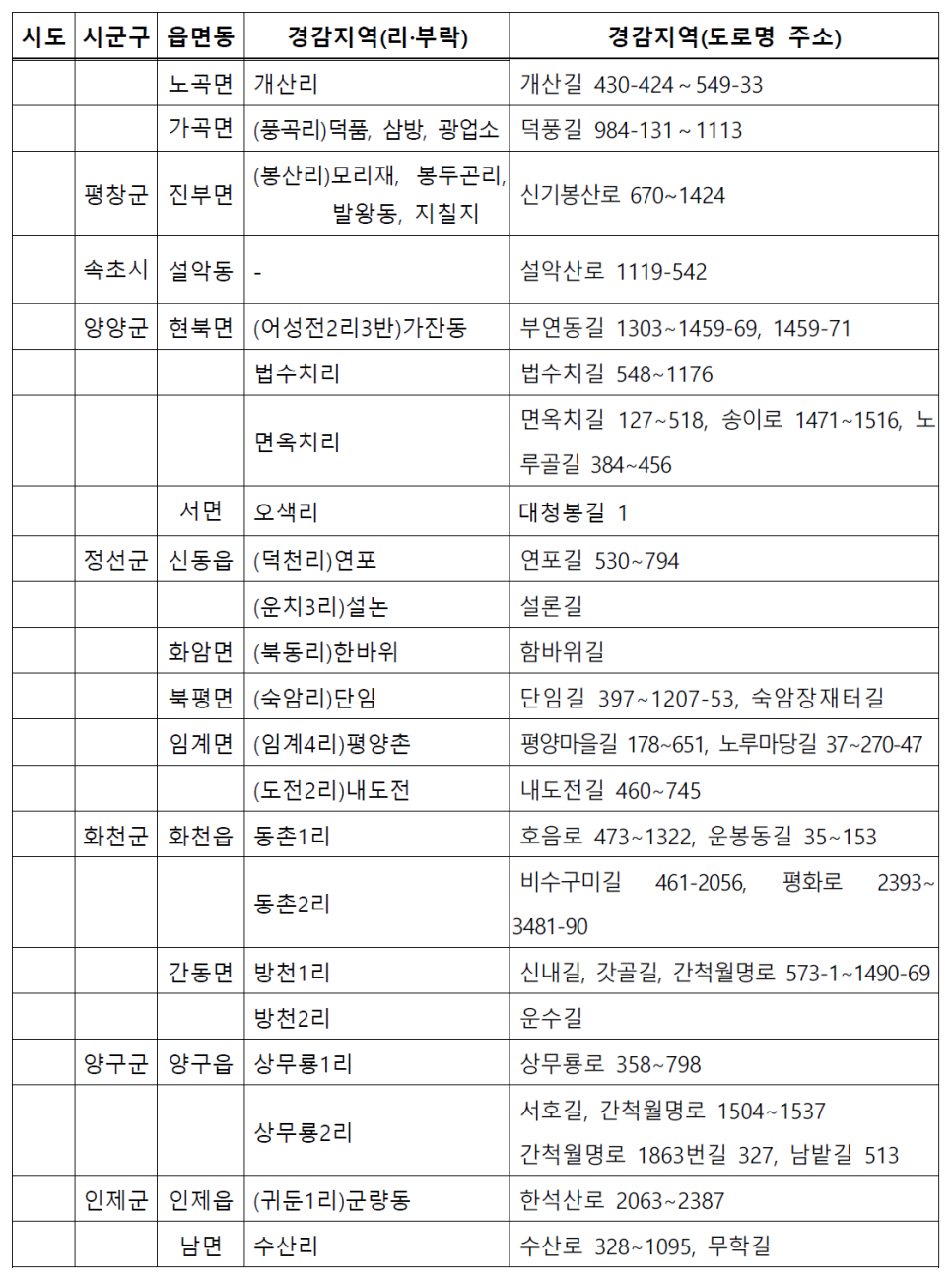 3. 강원 | 15 | 고성군, 동해시, 삼척시, 속초시, 양구군, 양양군, 영월군, 인제군, 정선군, 철원군, 태백시, 평창군, 홍천군, 화천군, 횡성군 |