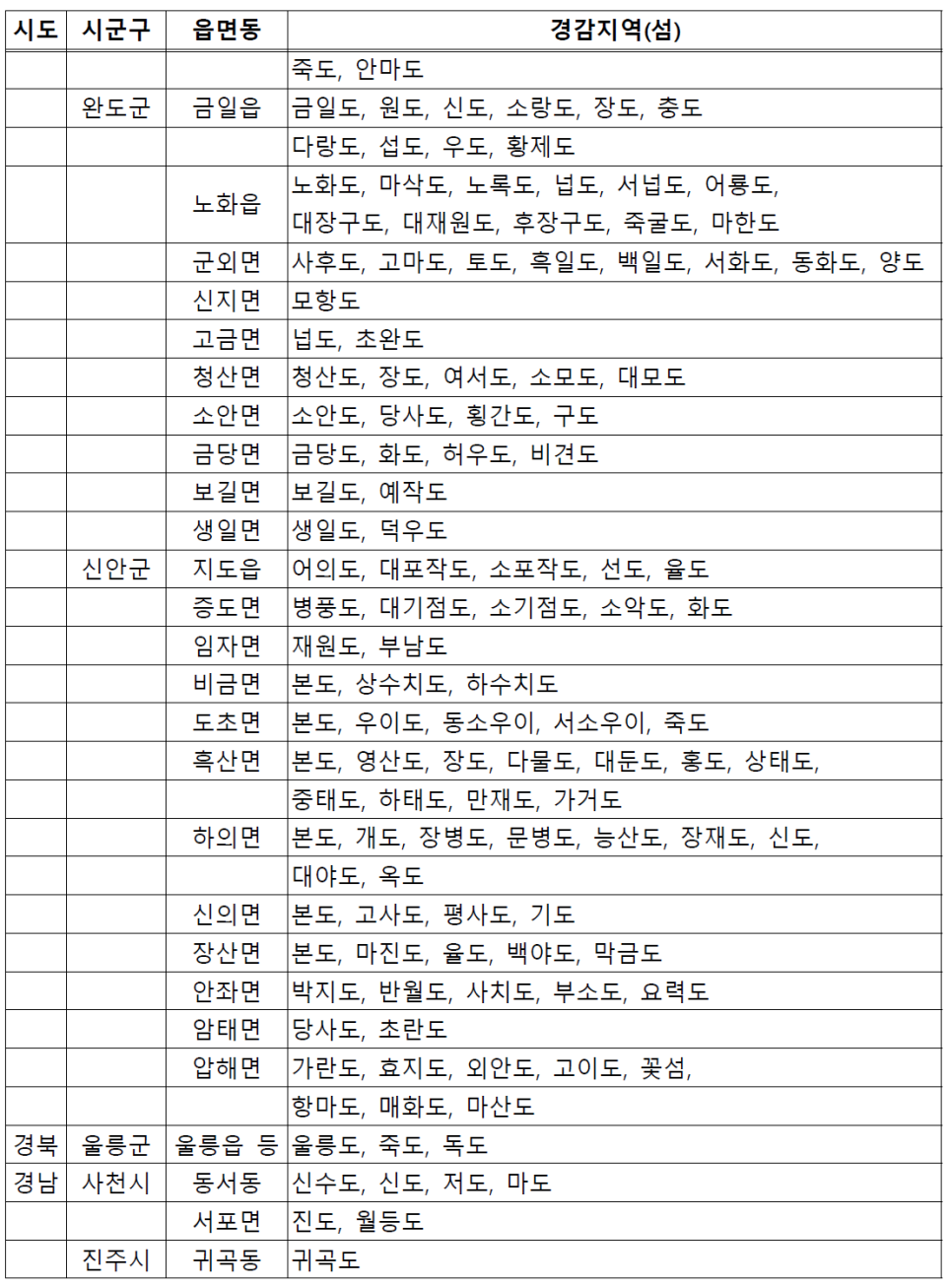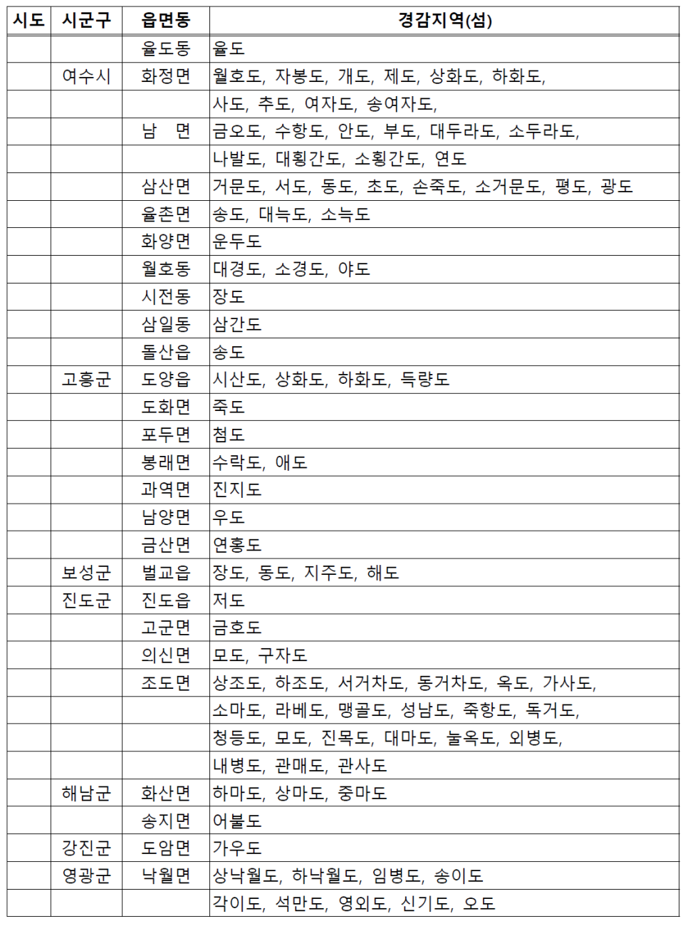 7. 전남 | 17 | 강진군, 고흥군, 곡성군, 구례군, 나주시, 담양군, 무안군, 보성군, 신안군, 영광군, 영암군, 완도군, 장성군, 장흥군, 진도군, 함평군, 해남군 |