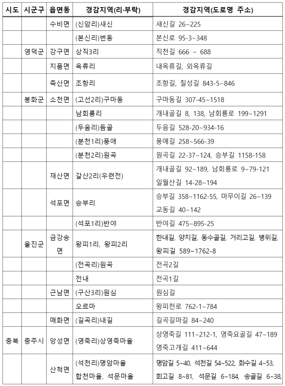 고령군, 문경시, 봉화군, 상주시, 성주군, 영덕군,
