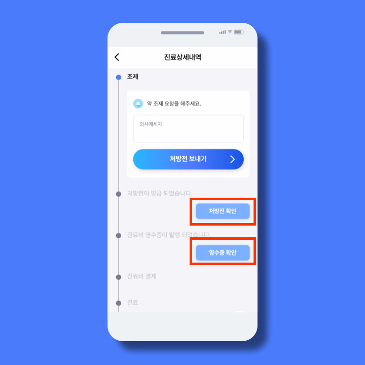 진행 내역에서 [수납 영수증], [처방전]이 확인 가능해요