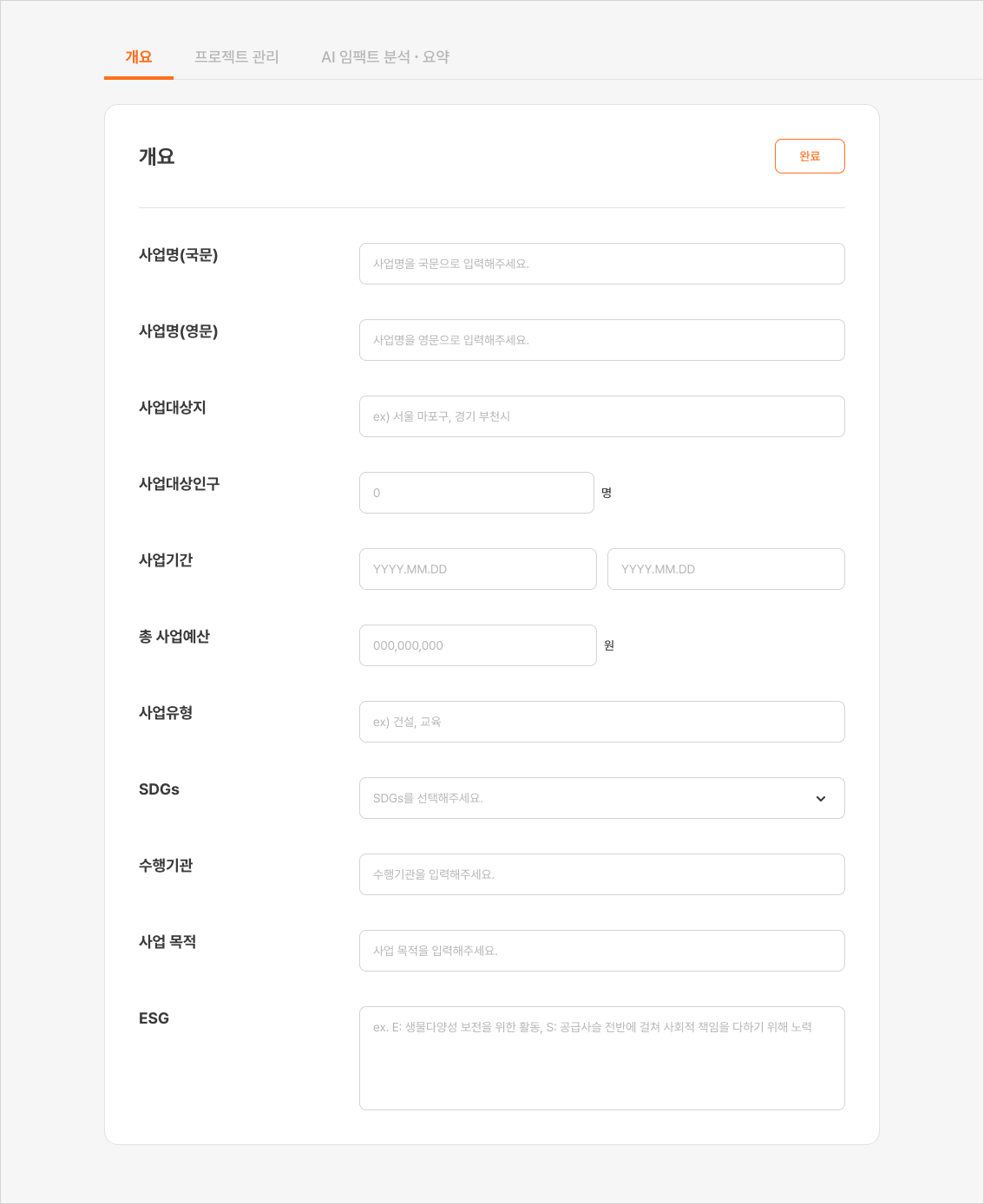 프로젝트의 전반적인 내용을 포함하는 요약 정보로, 목적과 기대효과를 담고 있습니다. 구조화된 형태로 작성하여 프로젝트의 핵심 내용을 쉽게 파악할 수 있게 합니다.
