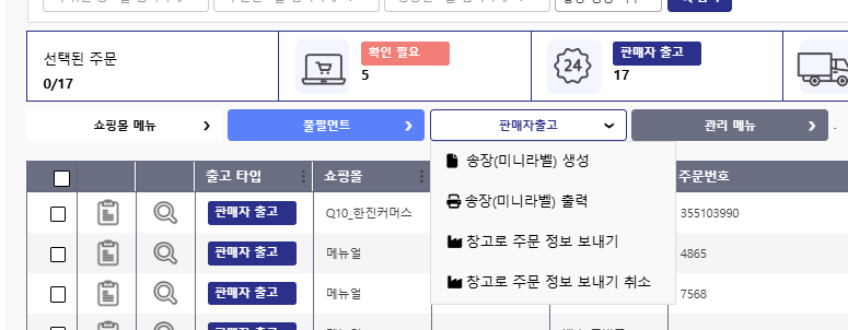 발송하실 주문 건을 선택한 후 판매자출고의 [송장(미니라벨)생성] 클릭하고 [송장(미니라벨)]출력을 클릭하셔서 라벨을 출력하여 실물에 부착하여 발송해주세요.