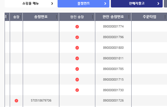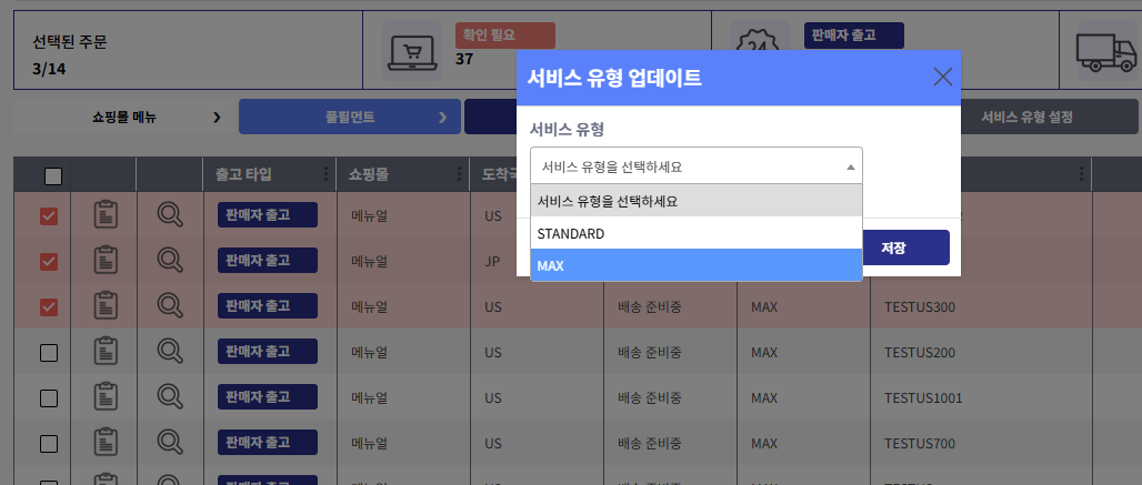 서비스 유형 컬럼이 비어 있거나 변경이 필요한 주문 건을 선택 후 [서비스 유형 설정] 버튼을 클릭하여 MAX / Standard / Economy 타입을 설정해주시기 바랍니다. 서비스 유형에 따라 배송사가 결정됩니다.