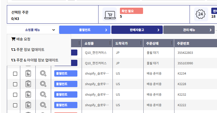 [주문 & 아이템 정보 업데이트]를 통해 주문건별 쇼핑몰 상태(주문 취소 등)를 업데이트 가능합니다.