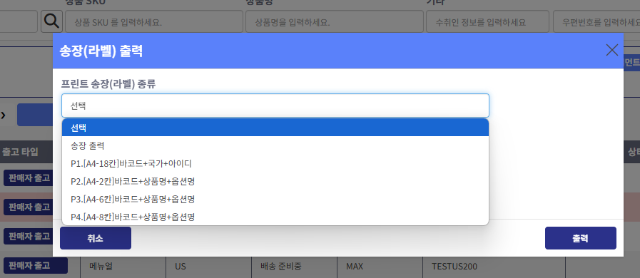 출력을 원하시는 사이즈로 선택 후 [송장 생성]을 한 뒤 [송장 출력]버튼을 통해 송장 출력을 해주세요.