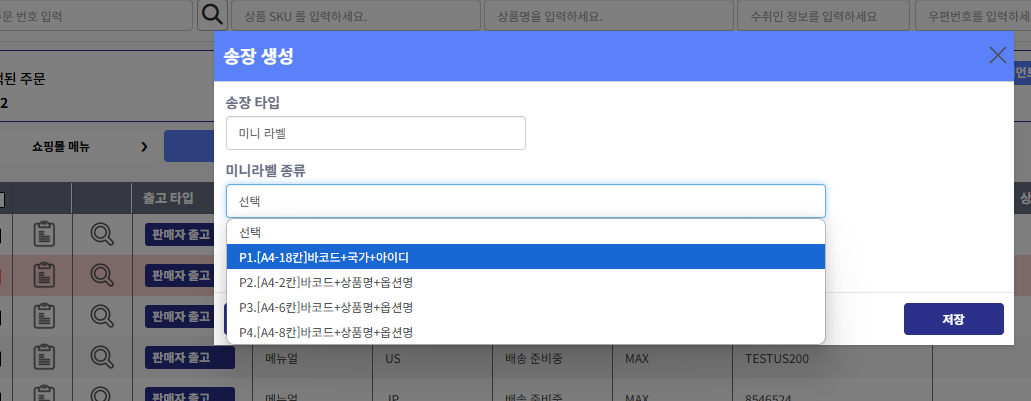 송장 컬럼의 빨간 버튼을 클릭하시면 낱장 단위로 송장(라벨)을 확인하실 수 있습니다.