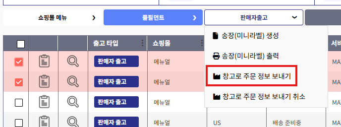 송장(미니라벨) 출력 후 발송하실 상품을 선택 후 [창고로 주문 정보 보내기]를 클릭해주세요.