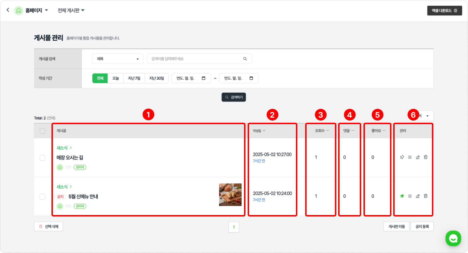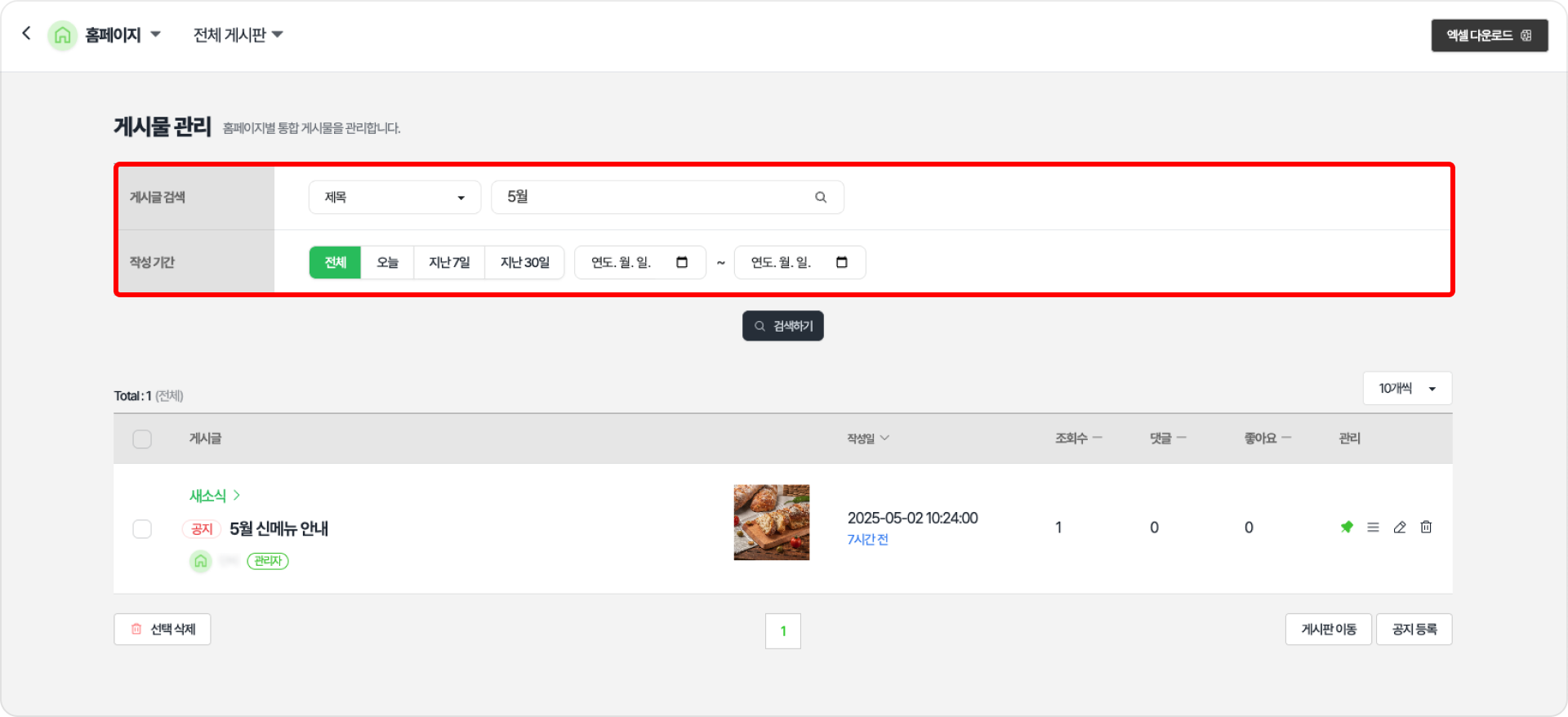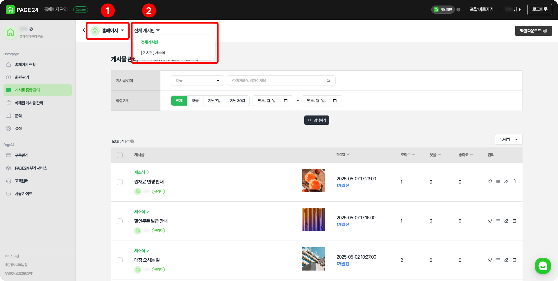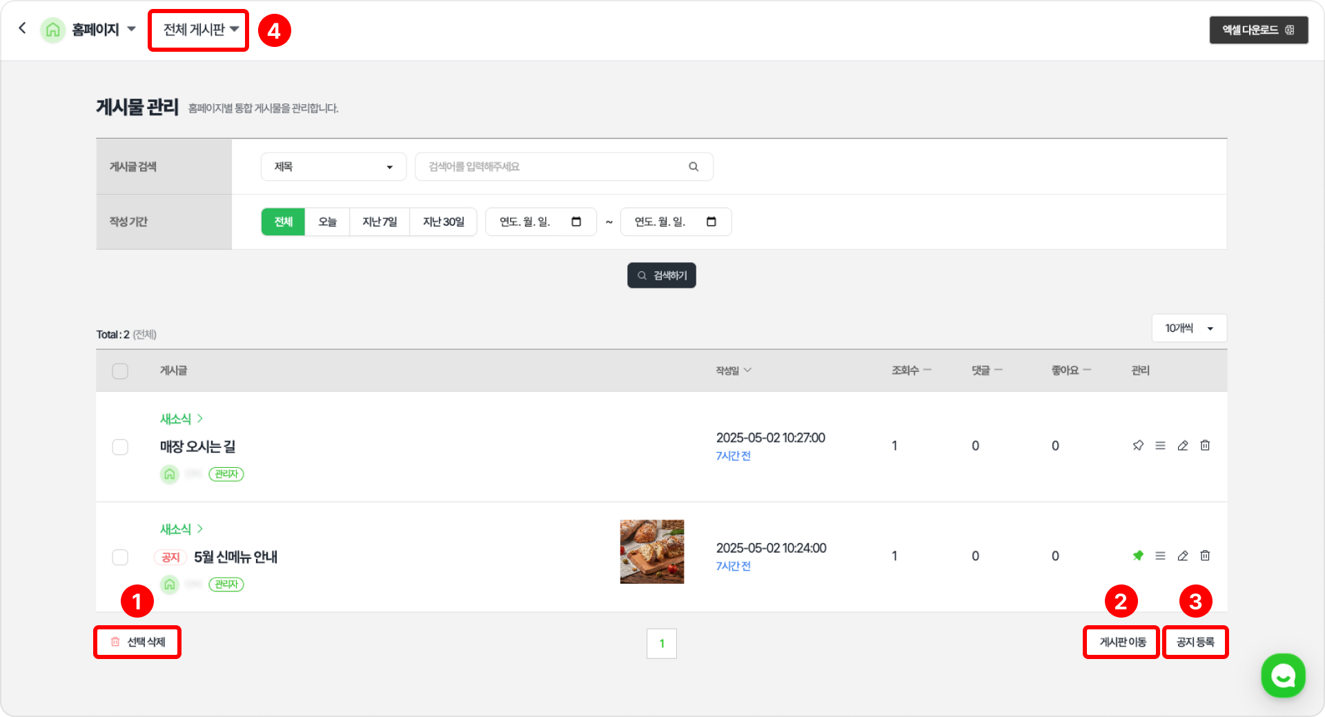 선택된 홈페이지의 ‘전체 게시판’ 또는 생성되어 있는 ‘게시판별’로 게시물을 관리할 수 있습니다.