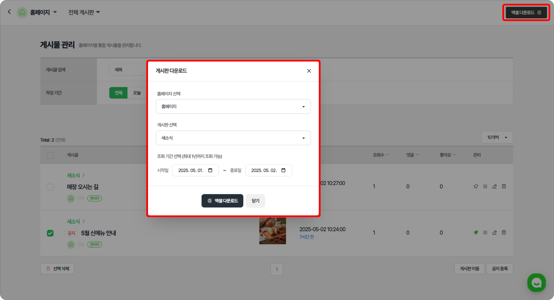 홈페이지, 게시판, 조회 기간을 모두 선택해야 엑셀 다운로드 버튼이 활성화됩니다.