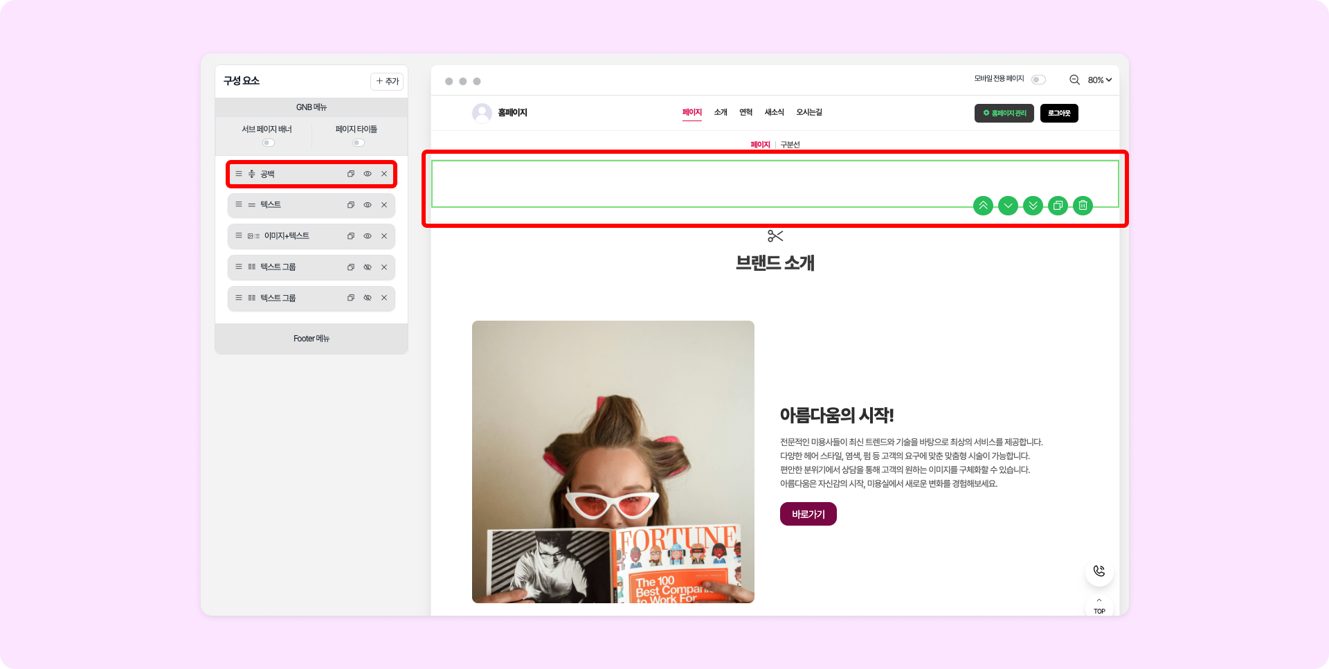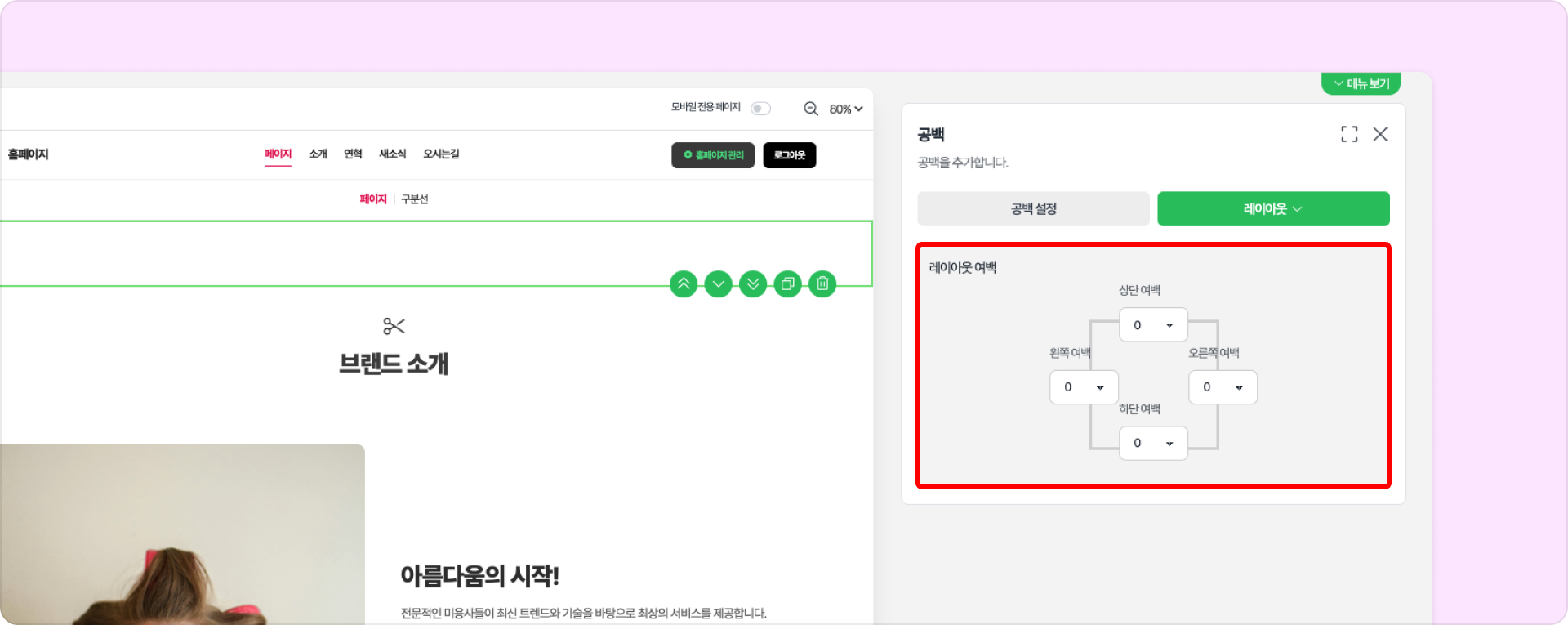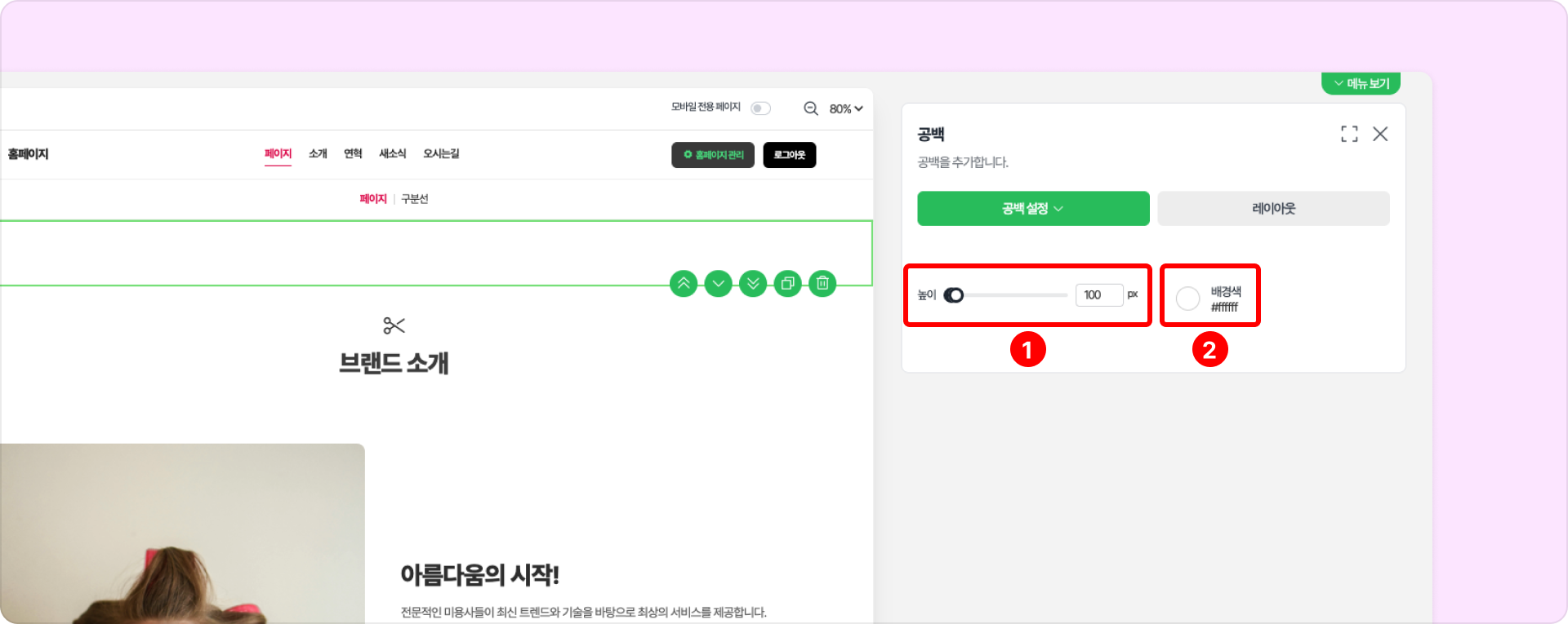 공백 구성 요소로 빠르게 여백을 추가할 수 있습니다.공백 설정❶ 높이: 슬라이더 또는 직접 픽셀 값을 입력하여 공백 크기를 조정할 수 있습니다.❷ 배경색: 구성요소 내 배경색을 설정합니다.레이아웃 설정공백 구성 요소의 위, 아래, 왼쪽, 오른쪽 여백을 각각 설정할 수 있습니다.