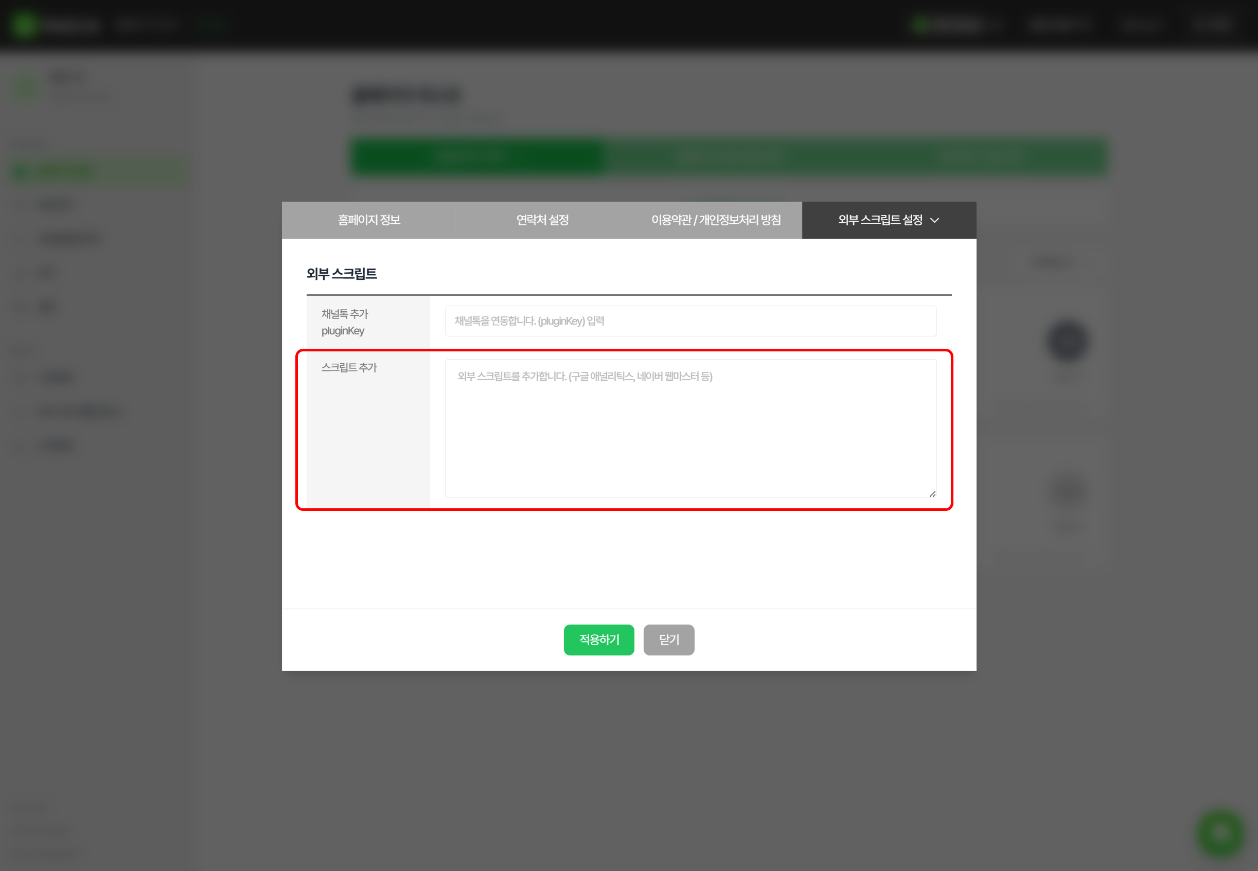 정보 수정 > 외부 스크립트 설정 > 스크립트 추가입력란에 복사한 스크립트를 붙여넣은 후,적용하기버튼을 클릭해 주시면 구글 애널리틱스 설정이 완료됩니다!