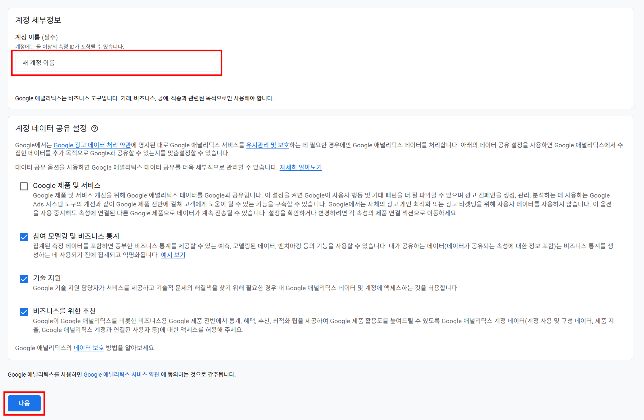 다음버튼을 클릭해 진행해 주세요. 계정 데이터 공유 설정 항목은 선택사항입니다.