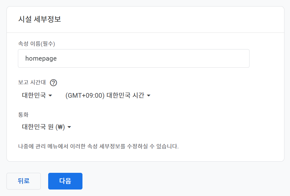 속성 만들기 단계에서 속성 이름과 보고 시간대, 통화를 설정해 주세요.