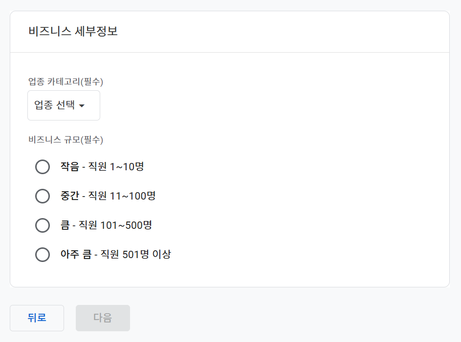 비즈니스 세부 정보 단계에서 업종, 비즈니스 규모를 선택하세요.