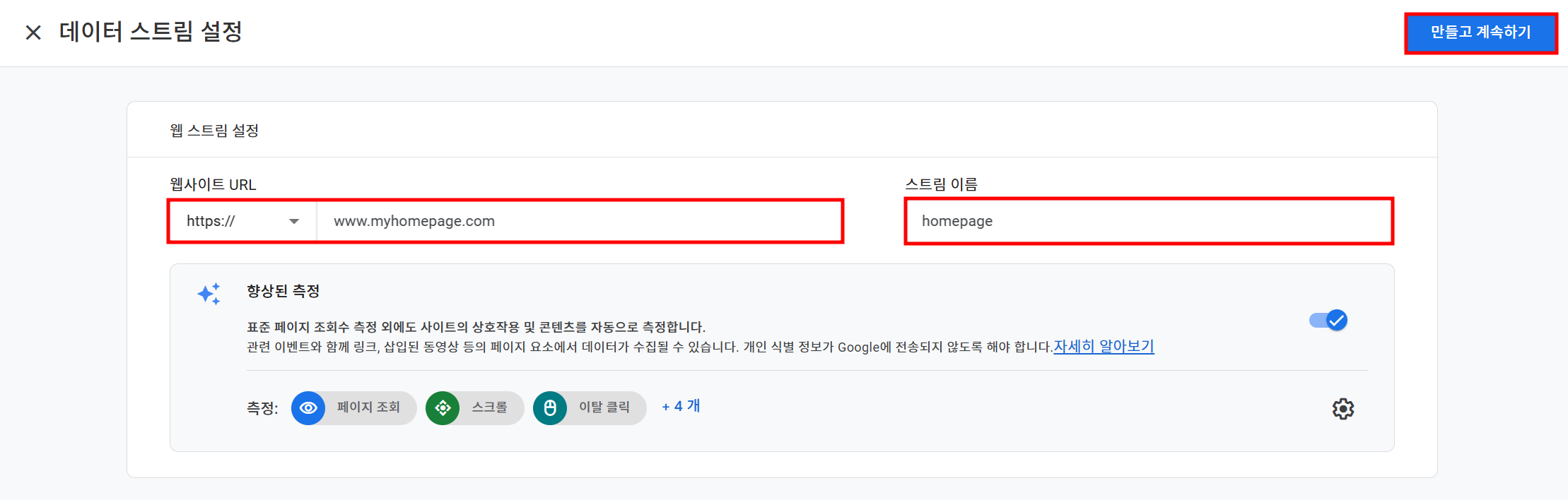 측정 시작버튼을 클릭해 주세요.계정 생성 단계에서 계정 이름을 작성하고,