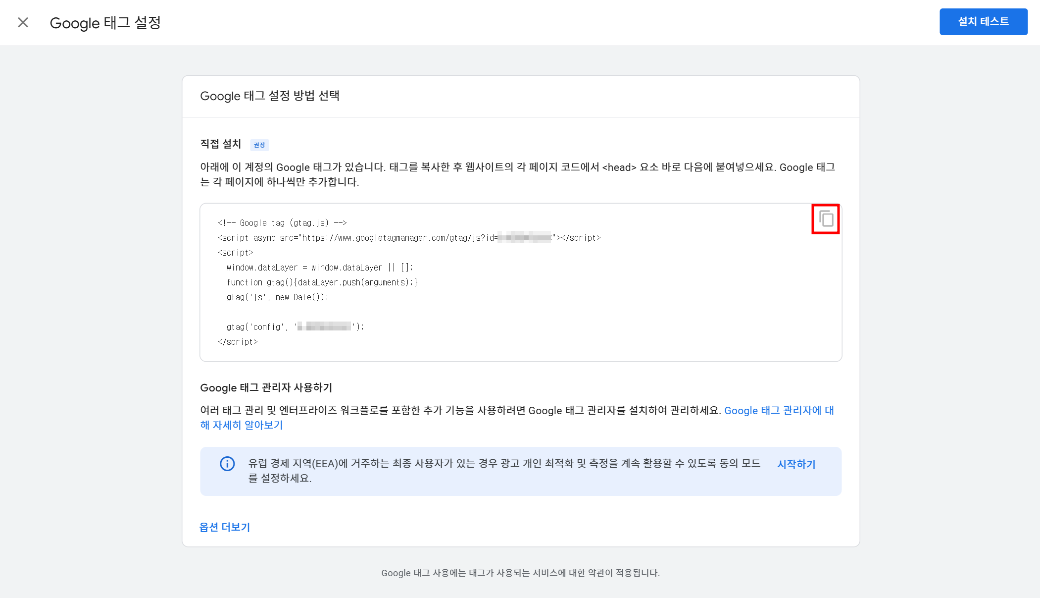 Google 태그 설정에서 아래 스크립트를 복사해 주세요.