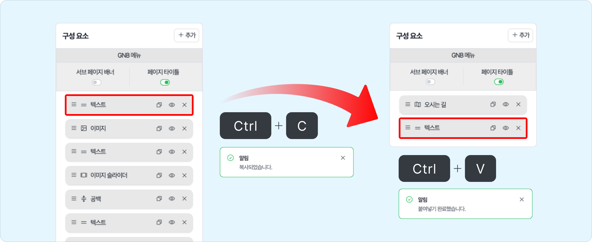 페이지 내 구성요소를 선택한 후, 단축키(Ctr+C(복사), Ctrl+V(붙여넣기))를 사용하여 쉽고 빠르게 요소를 복제하고 원하는 위치에 붙여 넣을 수 있습니다.