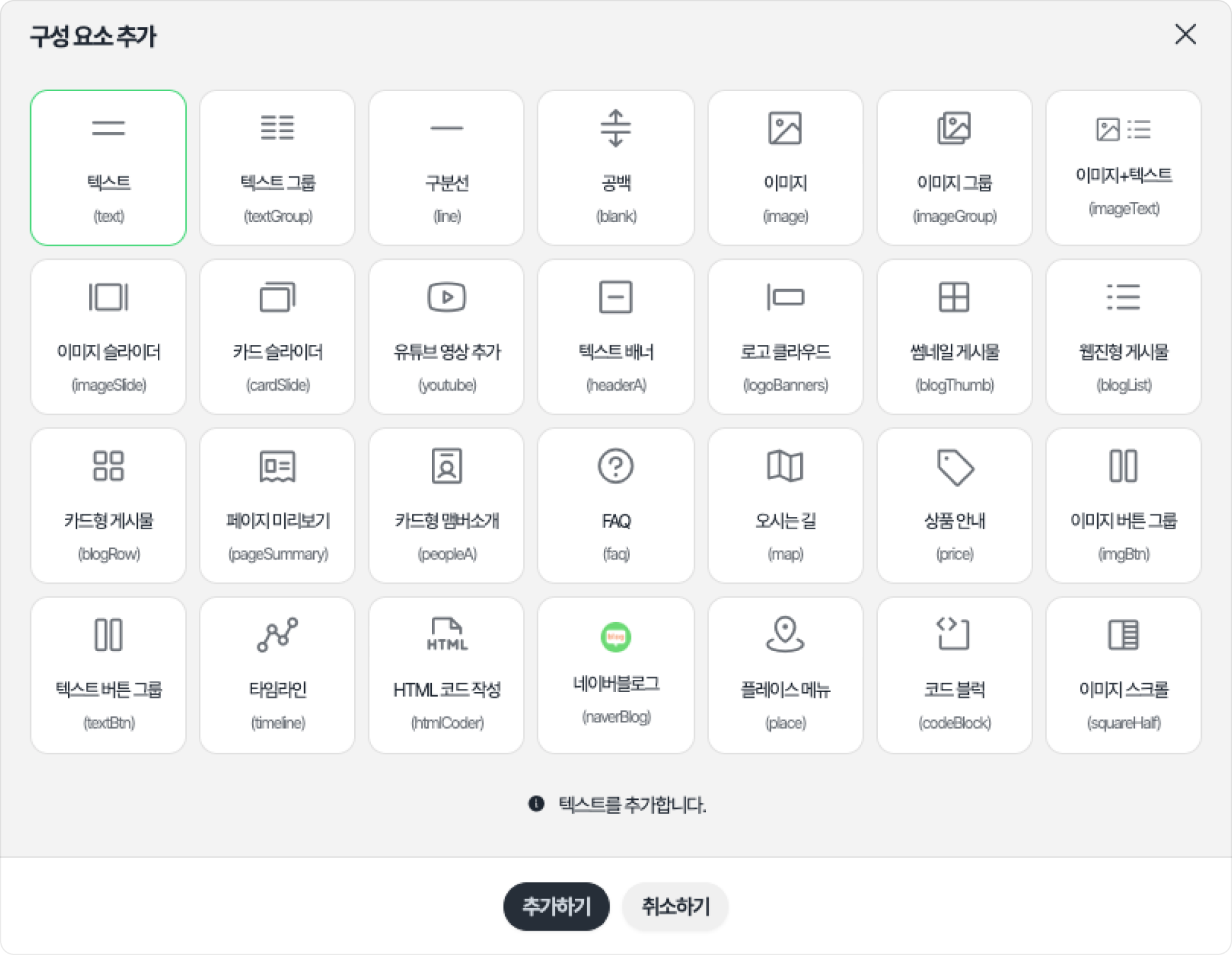 텍스트: 홈페이지에 텍스트를 삽입할 때 사용합니다. 메인 텍스트, 서브 텍스트를 입력할 수 있습니다.