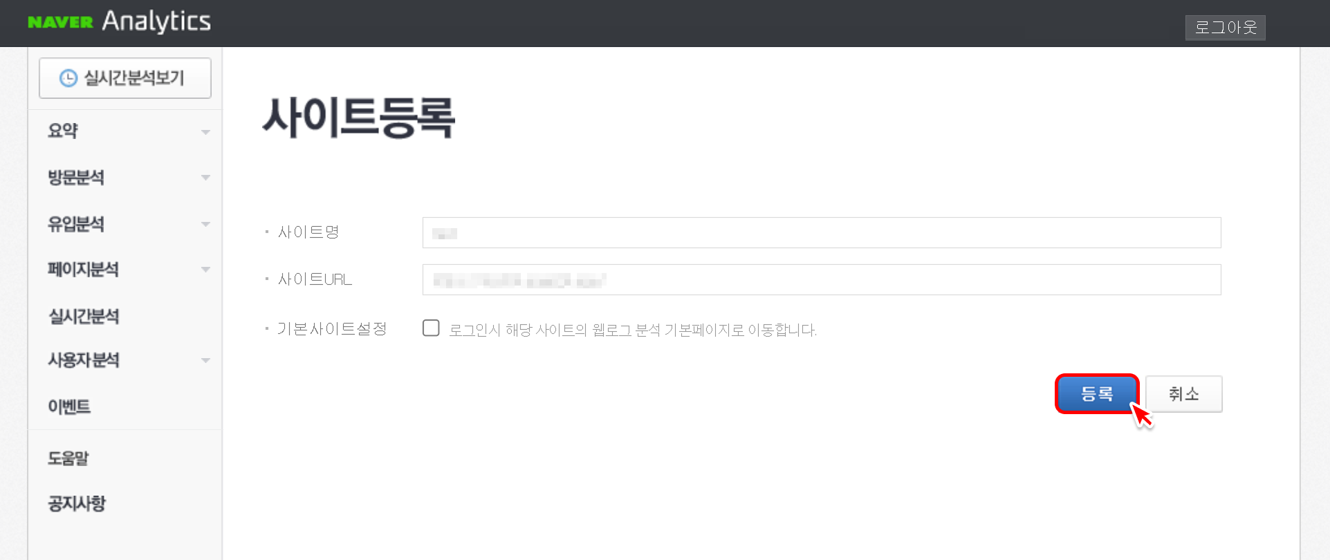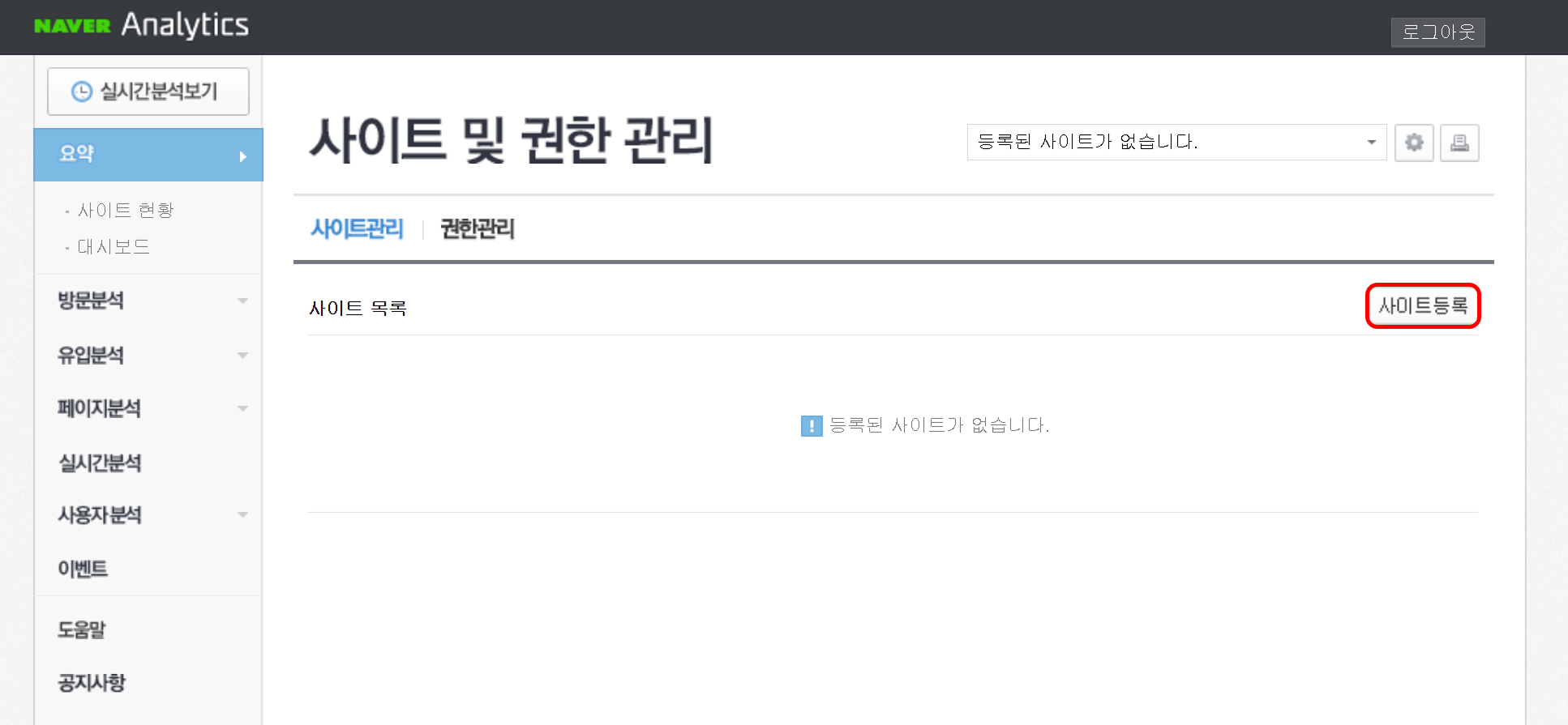 사이트 등록버튼을 클릭해 주세요.