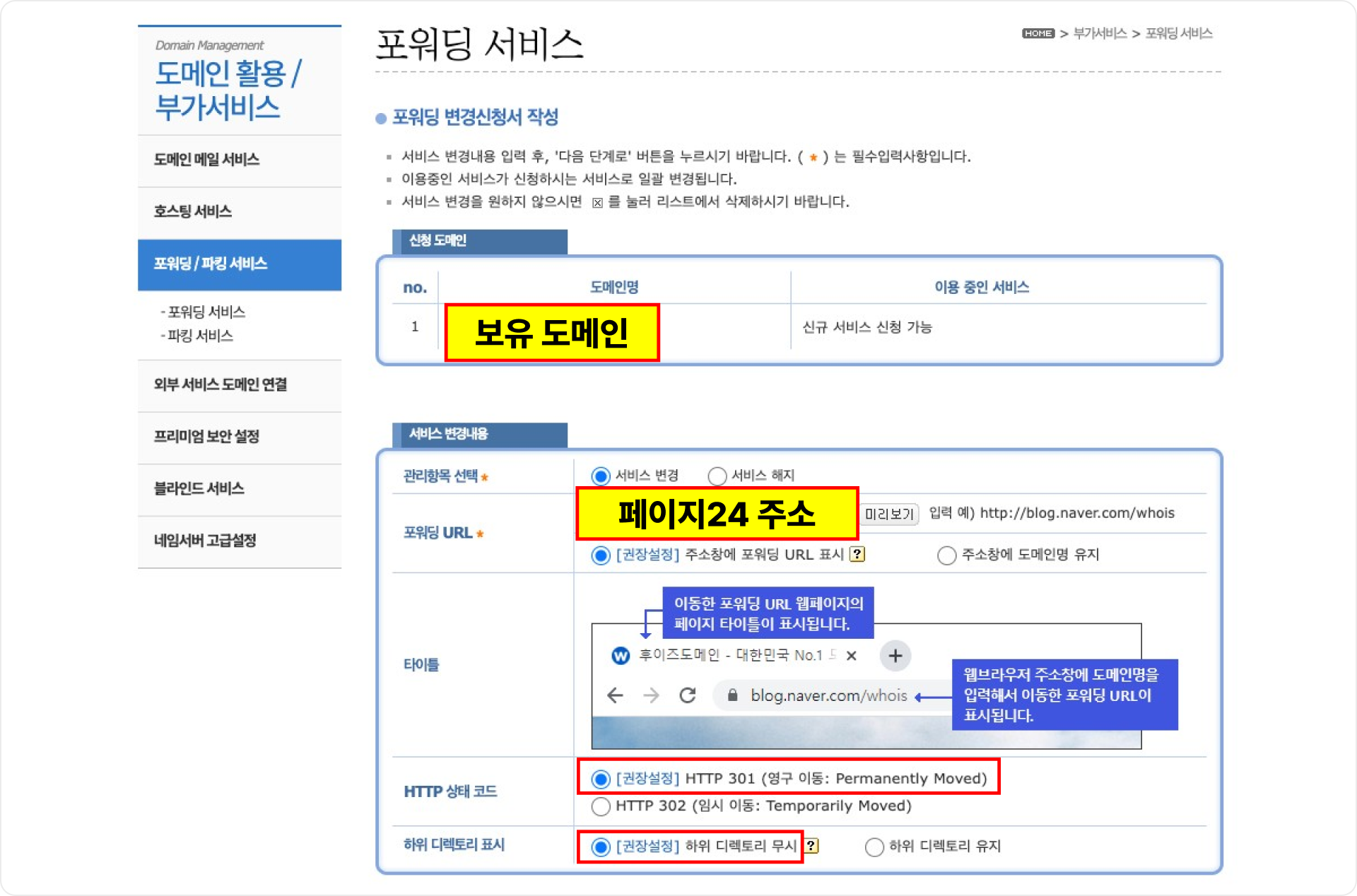 도메인 관리 > 도메인 부가서비스 > 도메인 포워딩 관리로 이동해 주세요.