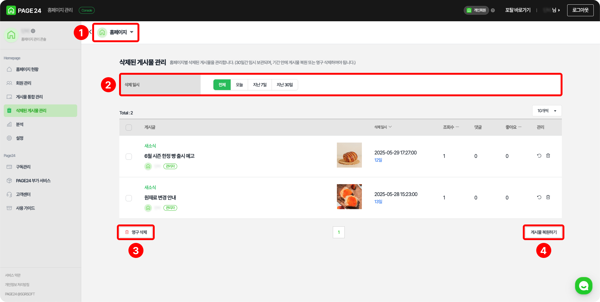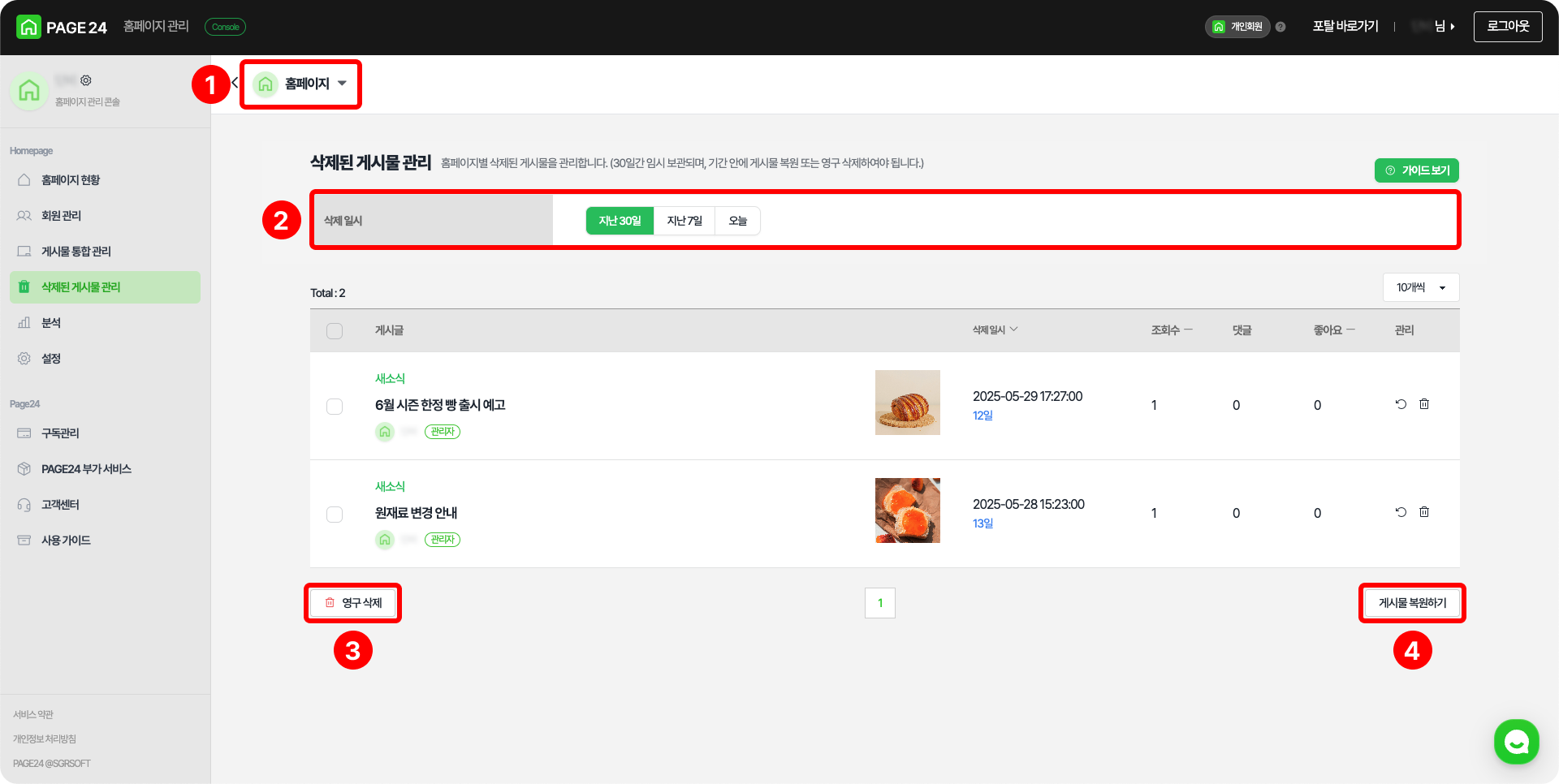 ❹ 게시물 복원하기: 선택된 게시글을 게시물 통합 관리로 복원합니다.