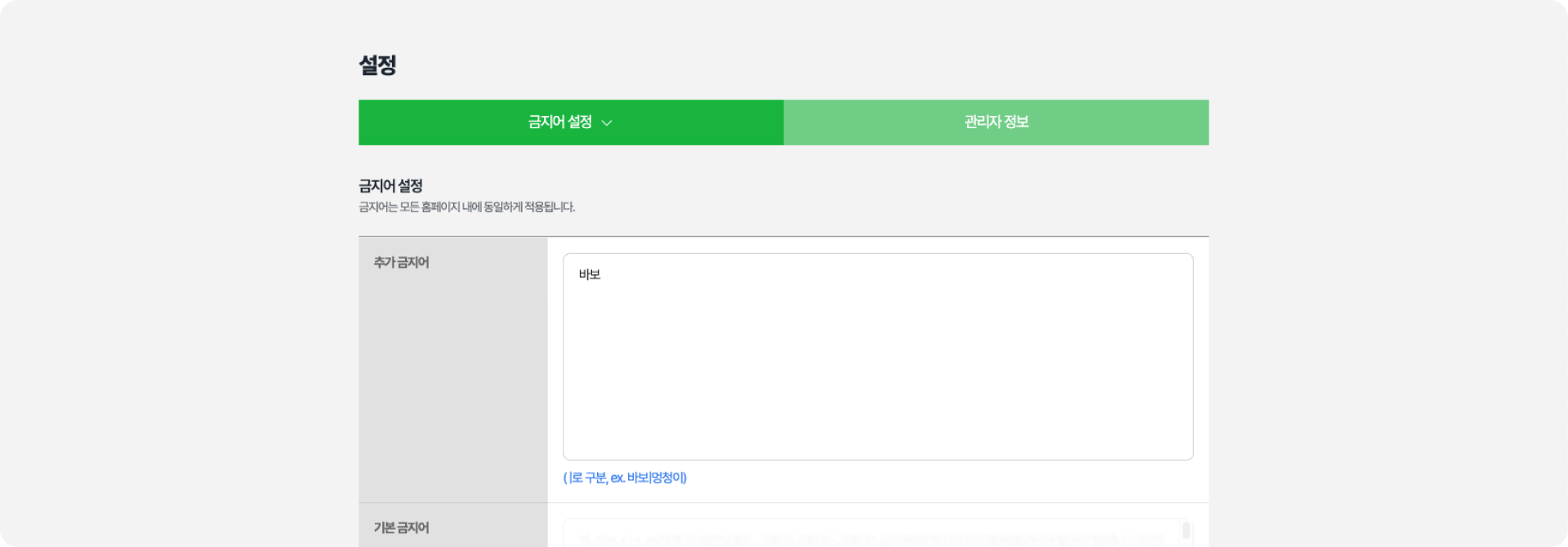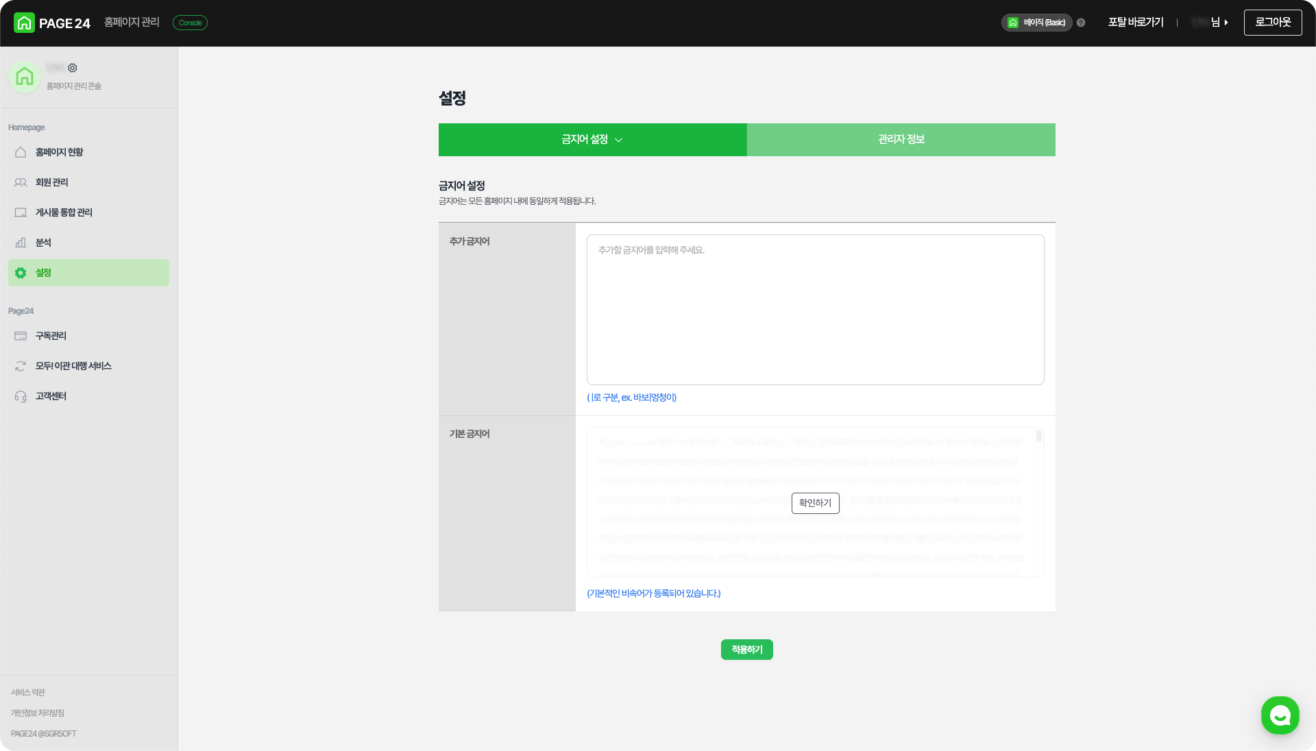 홈페이지의 금지어 설정이 가능합니다. 금지어는 보유한 모든 홈페이지에 동일하게 적용됩니다.