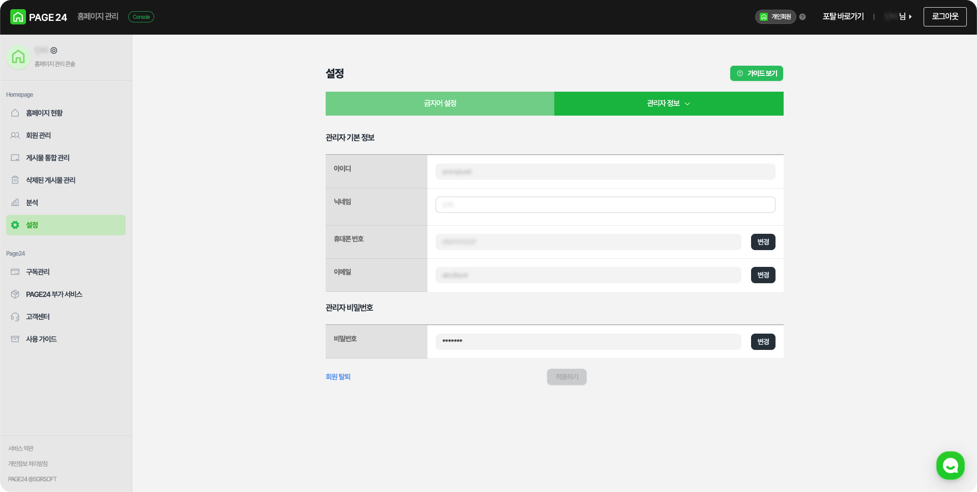 탈퇴하시려면 설정 - 관리자 정보 탭 클릭 - 좌측 하단