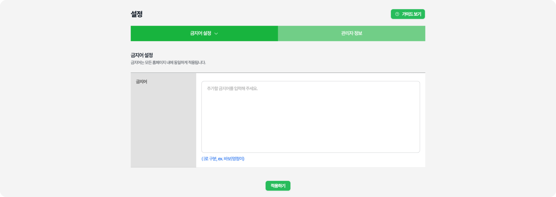 금지어를 추가할 경우, 추가 금지어 텍스트창에 단어를 입력한 뒤 하단 적용하기를 클릭합니다.