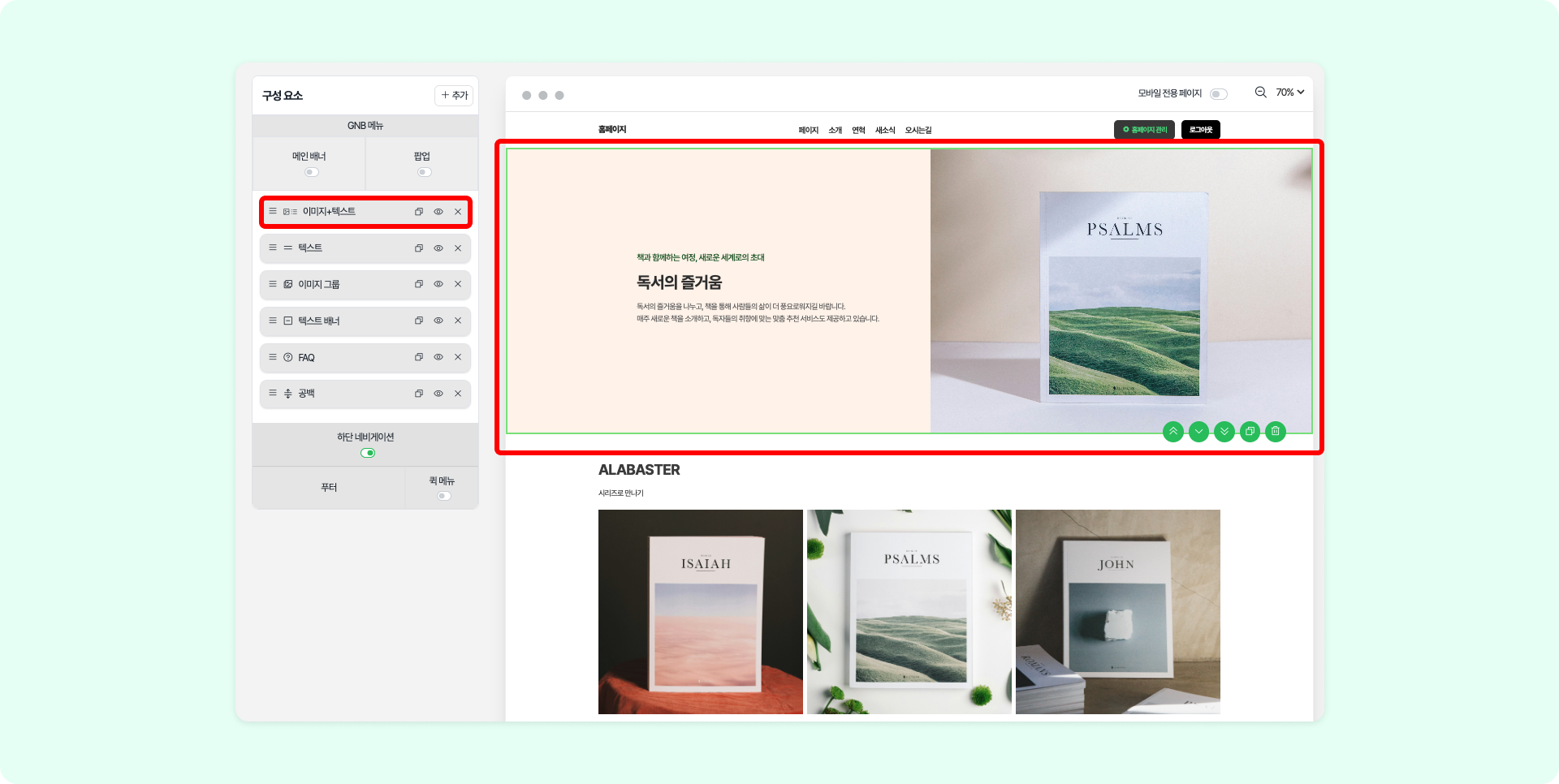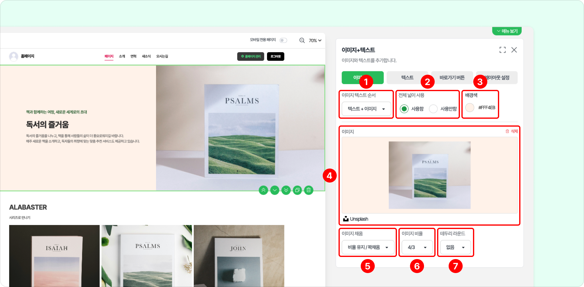 이미지+텍스트: 왼쪽에 이미지, 오른쪽에 텍스트 순서로 설정합니다.