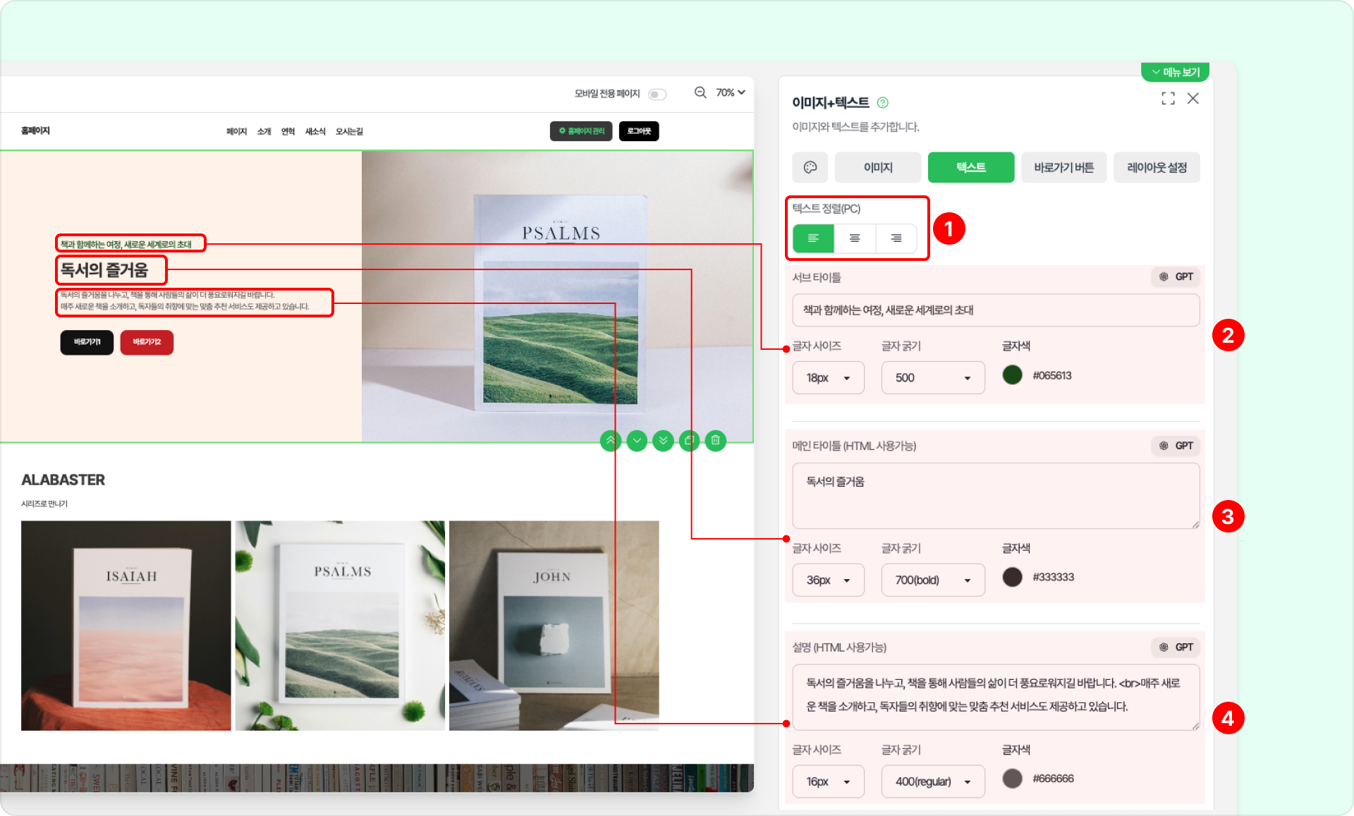 ❶ 텍스트 정렬: 텍스트를 왼쪽, 오른쪽, 가운데 정렬로 설정합니다. PC, 모바일 화면 각각 설정할 수 있습니다.